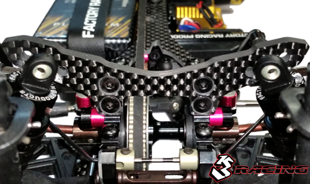 Newly designed front and rear shock towers, let you easier to use the alignment bar while assembling; by pressing it on top of towers then screw in all the screws on the upper chassis, can ensure the car is leveled.