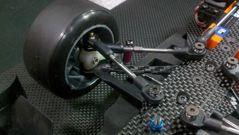 Steering Blocks: Tamiya F104 50395 Uprights with custom Carbon Fiber extension.