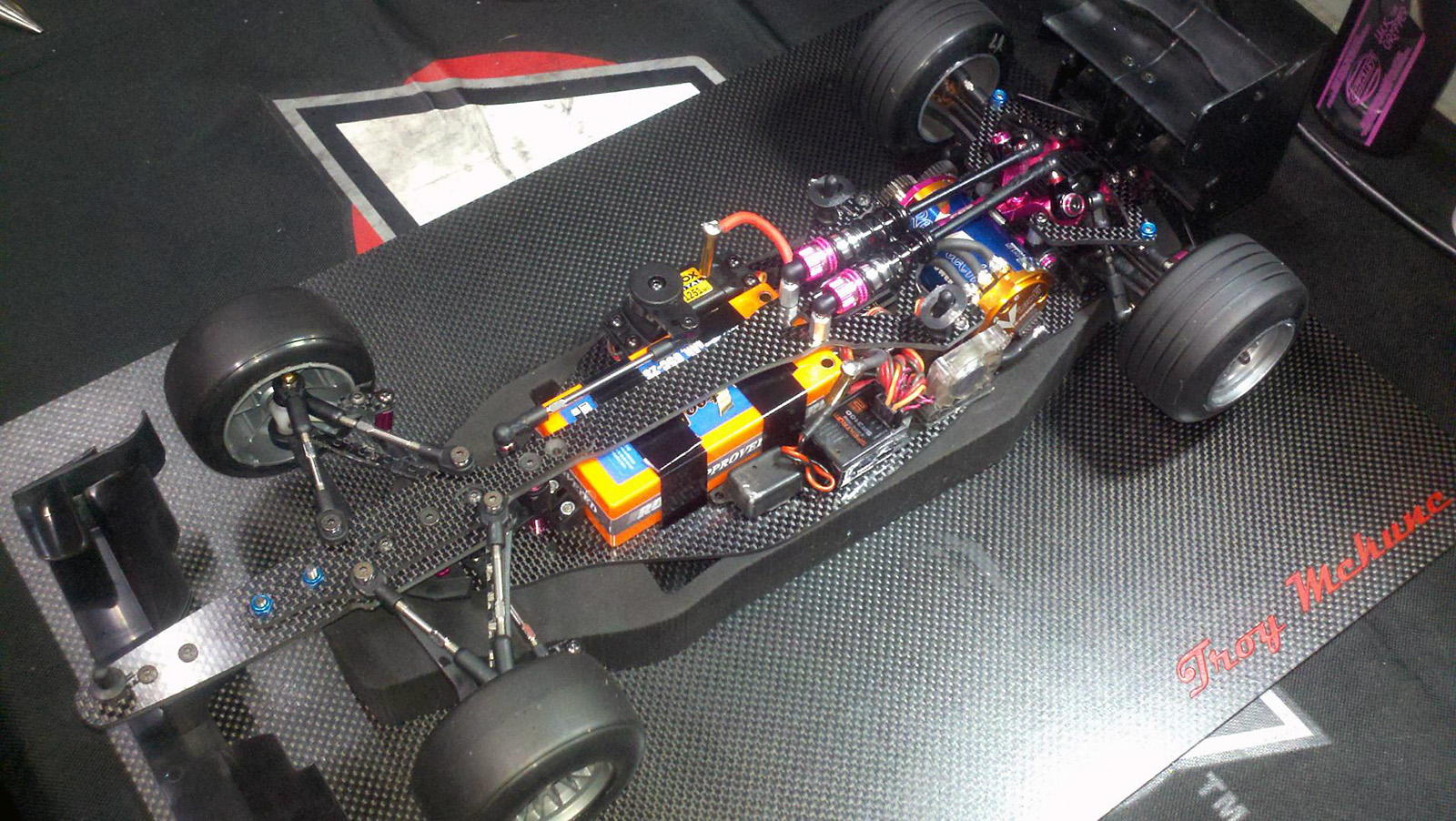 Battery forward with ESC inline. A very stiff rear end and a ton of front caster (Between 8 and 10 degrees) with the soft slicks is critical for this setup. This results in a car with tons of on power steering. This also eliminates the front chatter on high speed sweepers and off power steering or hard breaking and steering.