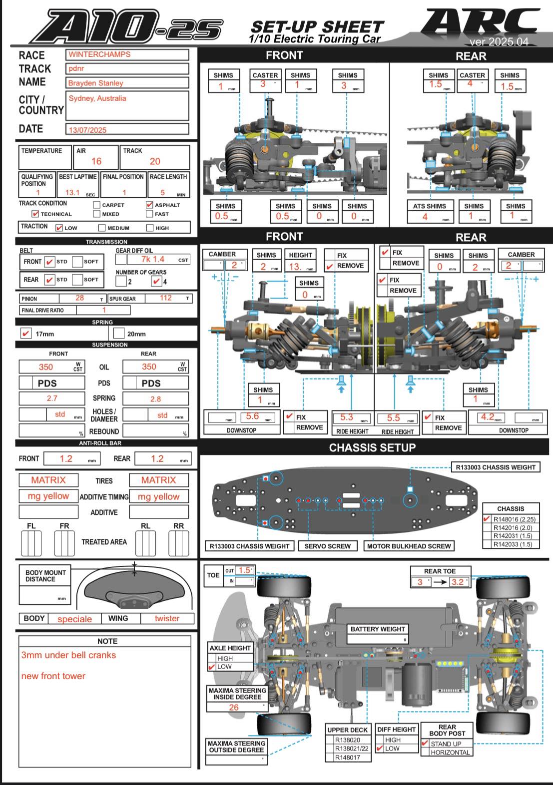 Car - ARC A10-25 Electronics - Hobbywing 4.5t + G3 Servo - Powerhd S15 Accesories - SMOKEM + RCMAKER Radio - FLYSKY NB4 Pro+ Little spotlight on the titanium turnbuckle set from Smokem that shed some weight off and got the COG nice and low