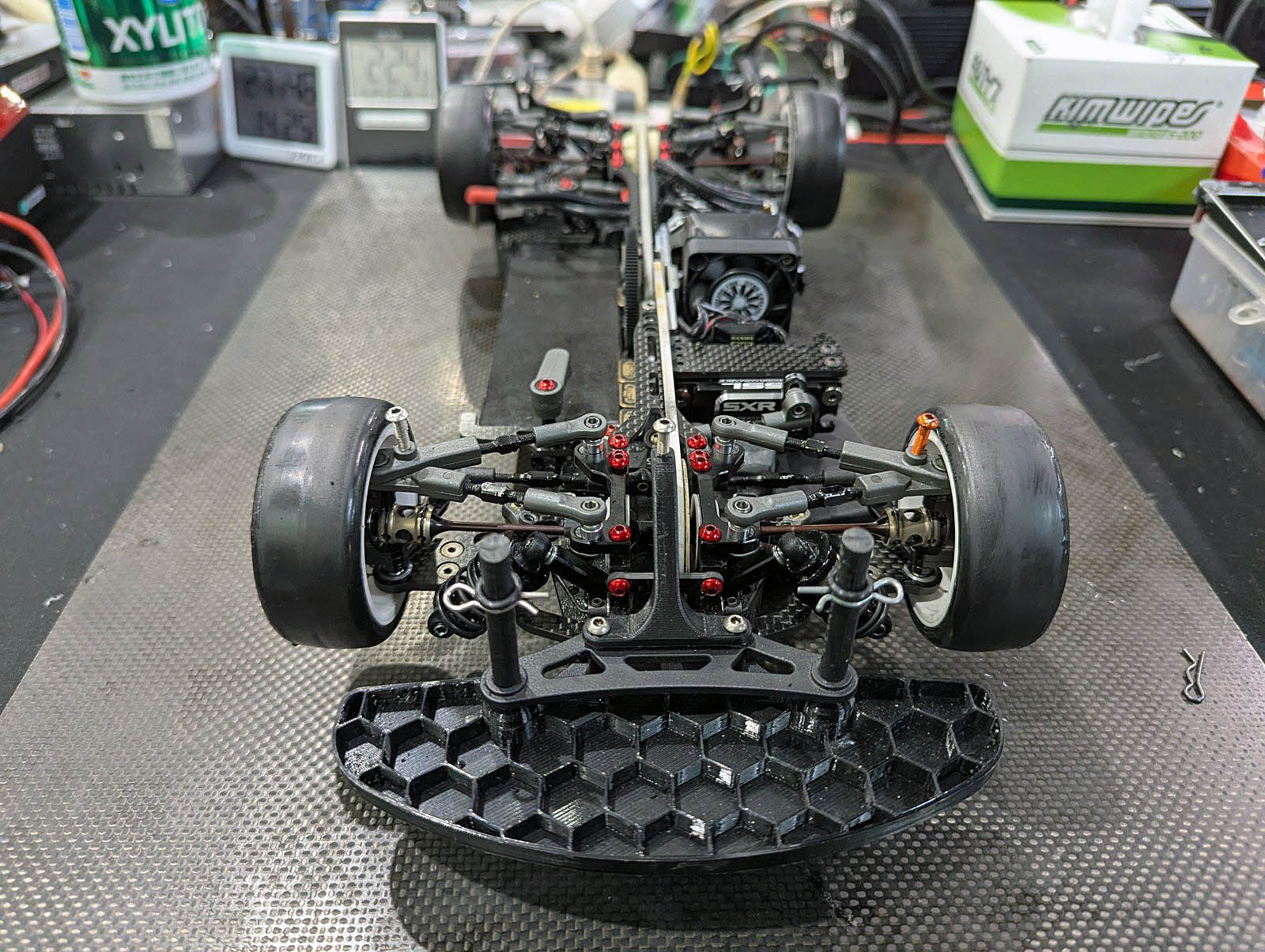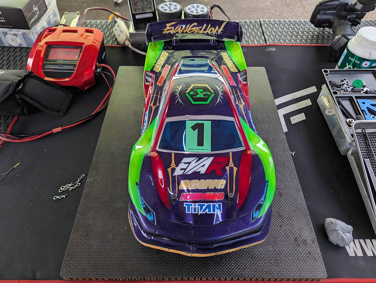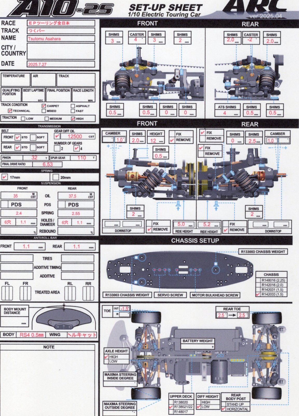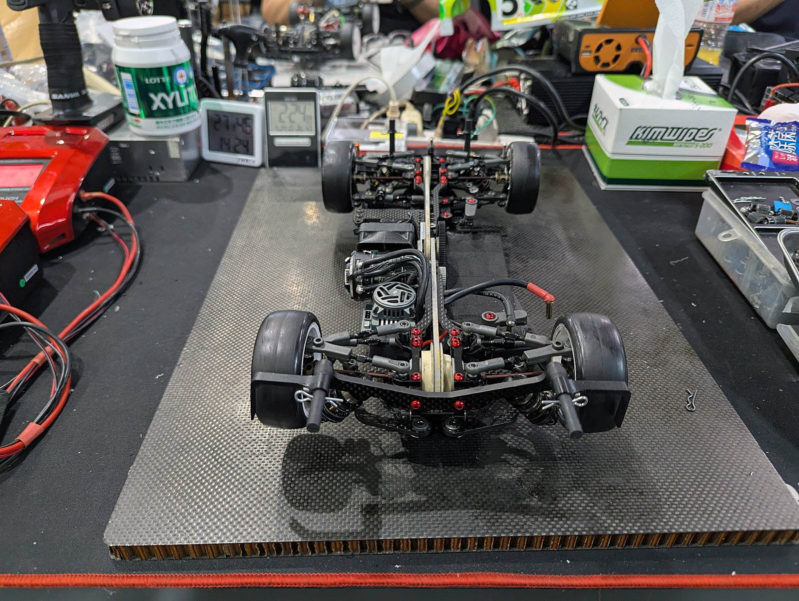 - The tires used were RUSH28CPX, and the car ran without shoulder glue.
