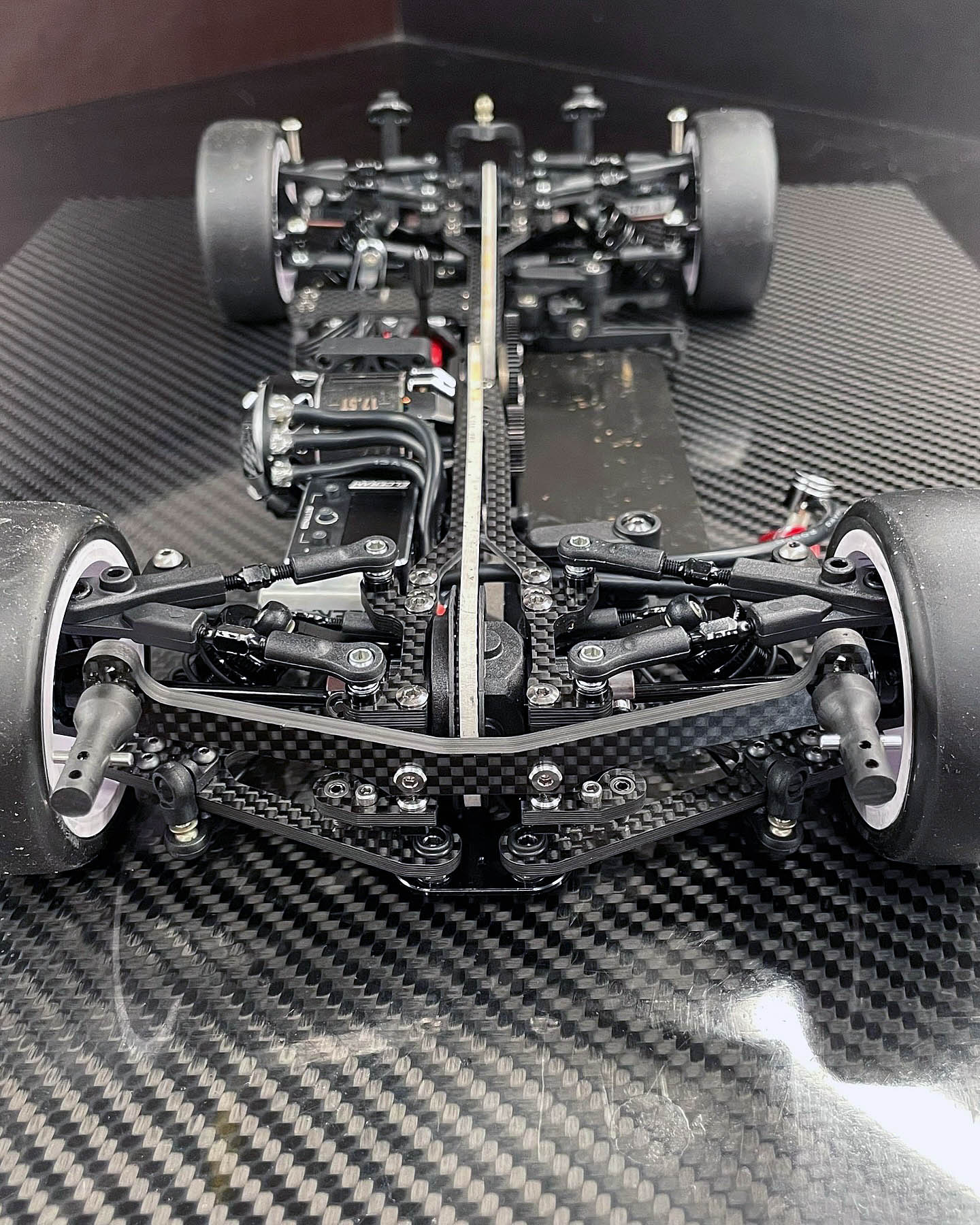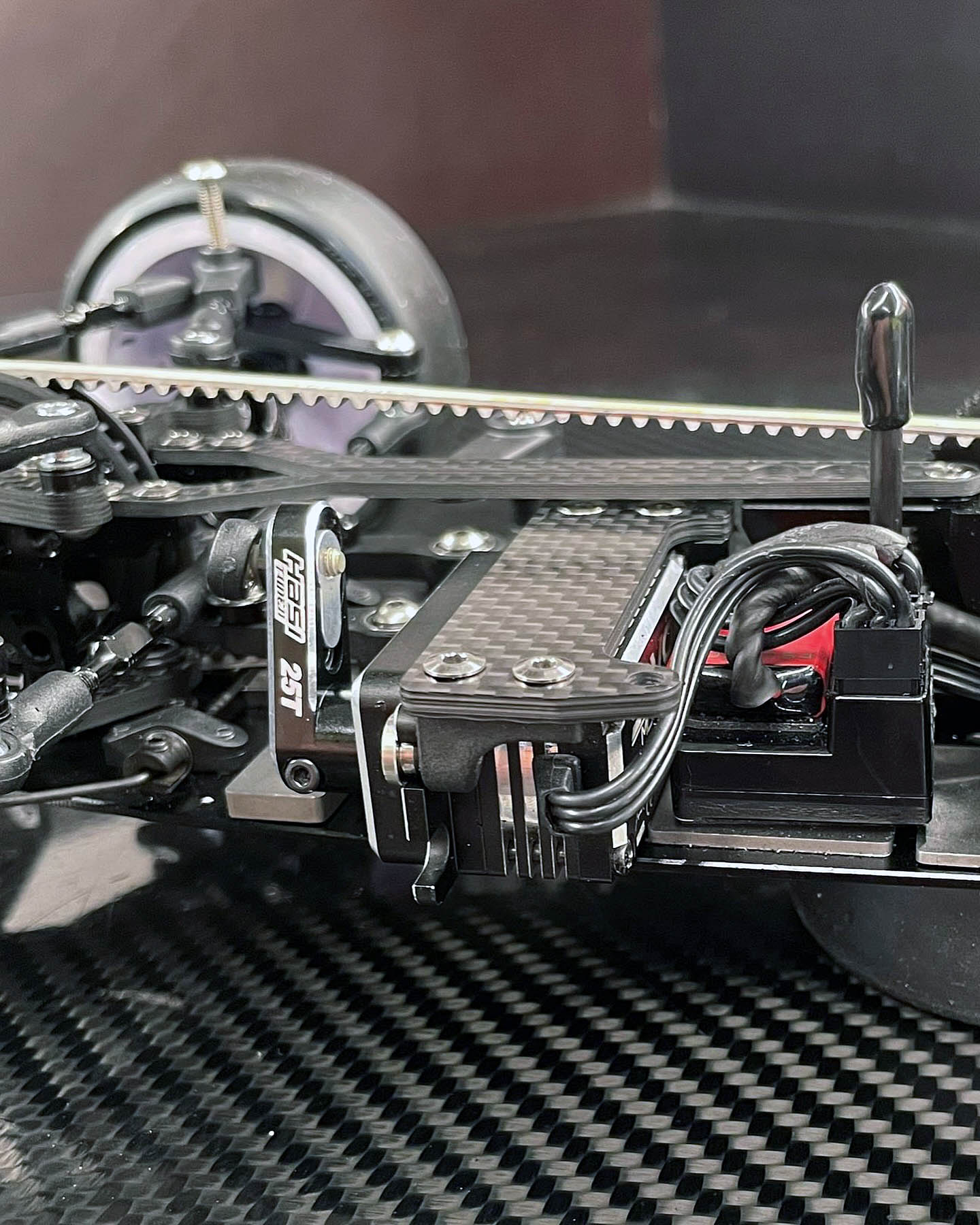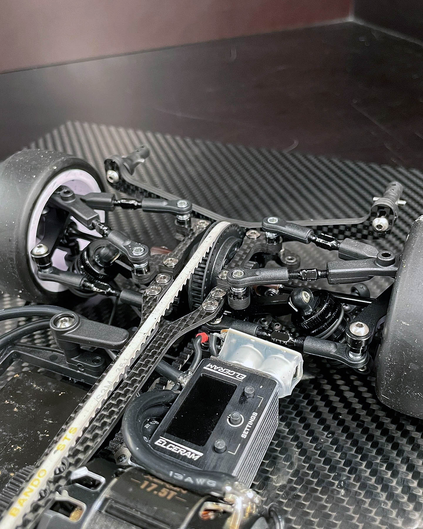 The most critical adjustment was applying glue higher up on the front tire sidewalls. While we typically run 59–60mm of glue at ETS, the increased traction required us to raise the glue line significantly to 62–63mm. This improved drivability and prevented the car from traction rolling (flipping).