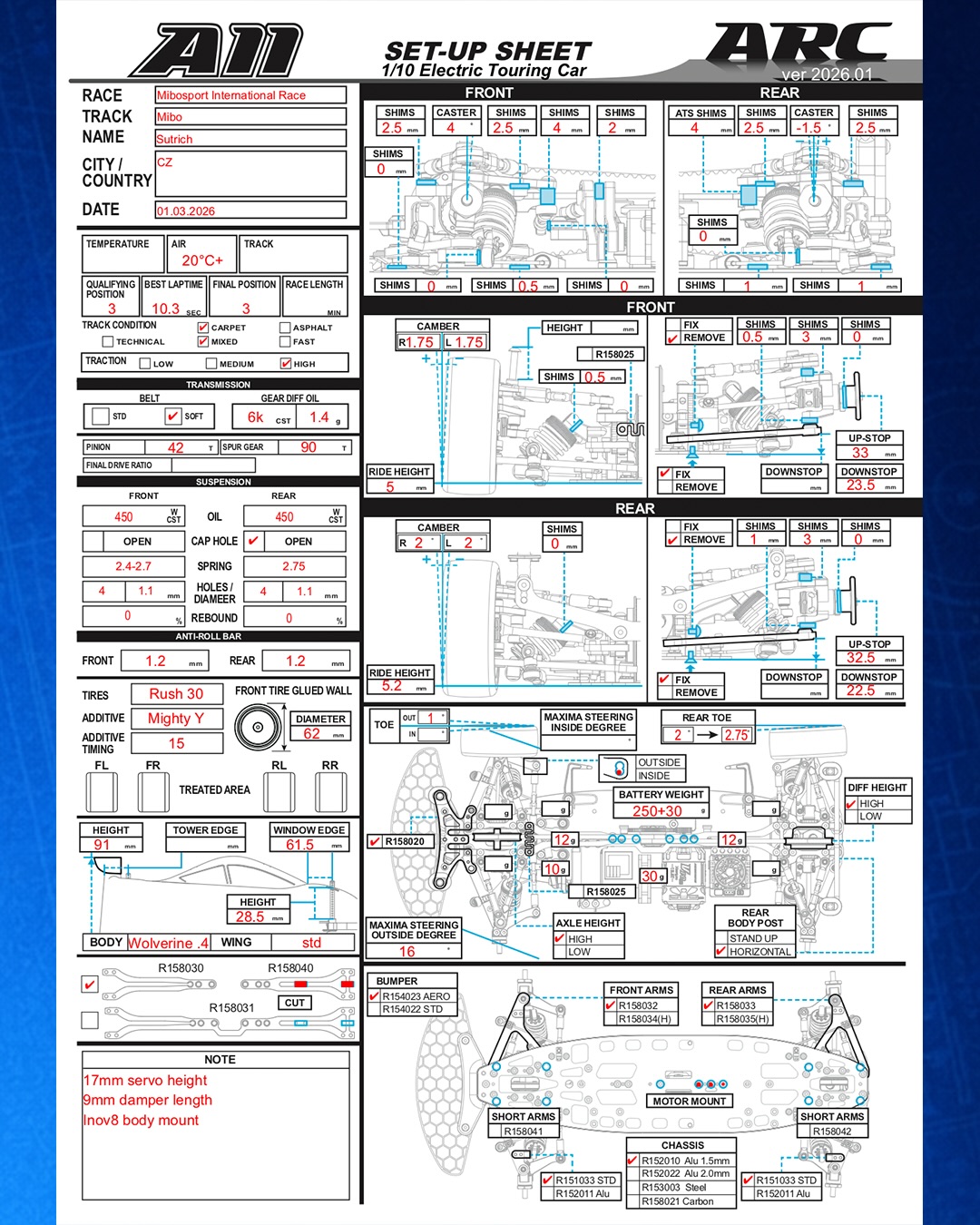 Another crucial factor in high-grip conditions is the use of upstops, a new feature on the A11. Their function is straightforward: by running less upstop travel (a smaller value on the gauge), the chassis stops rolling earlier, which significantly reduces the risk of traction rolling. This tuning option can also be applied to the rear—for instance, to prevent the car from squatting too heavily into the rear suspension when accelerating out of corners.