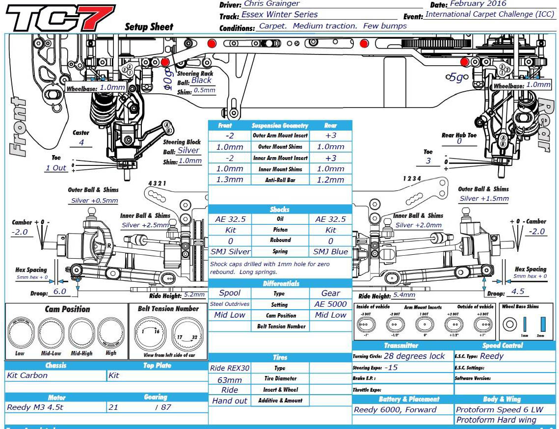 Chris Grainger's A-Final setup from the ICC, held at the Essex Winter Series venue, last weekend. Should be a great starting point for any carpet racing!