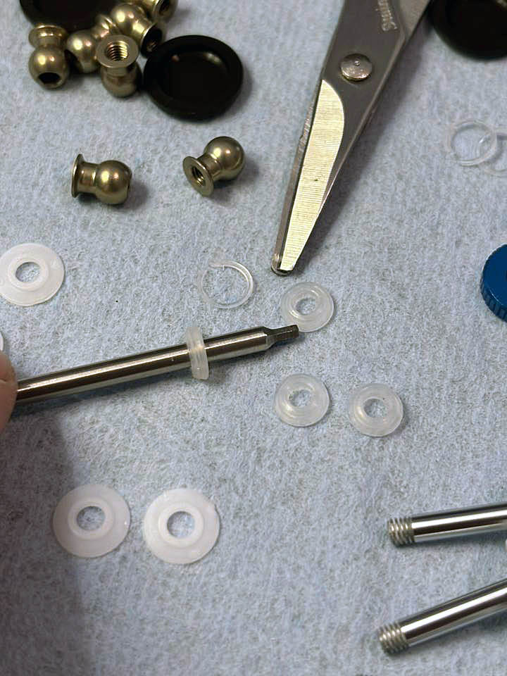To make extra smooth suspension, cut little bit from one corner of the x ring. And lubricate x rings with greenslime before assembly. Also make sure you dont have any extra plastic in shock internals. You can also polish the shafts. Cut all extra plastic that is left from mold. You can cut it or use really fine sandpaper. In the picture you can see this extra material. I personally like to polish the shafts just to make suspension buttery smooth. Left one is polished. Difference is small on table and hard to show in picture, but you can definetly feel the difference once all these 3 steps are done.