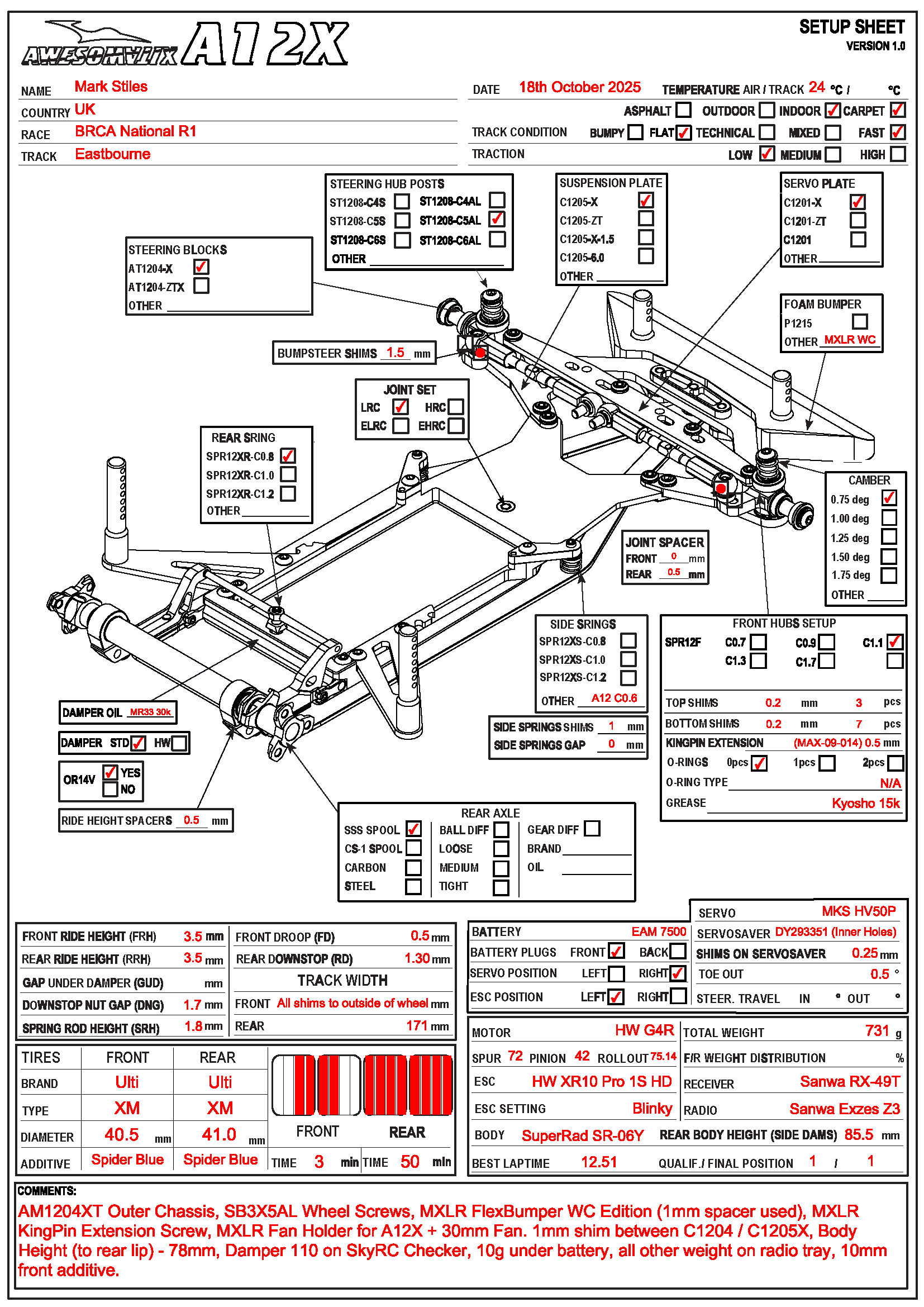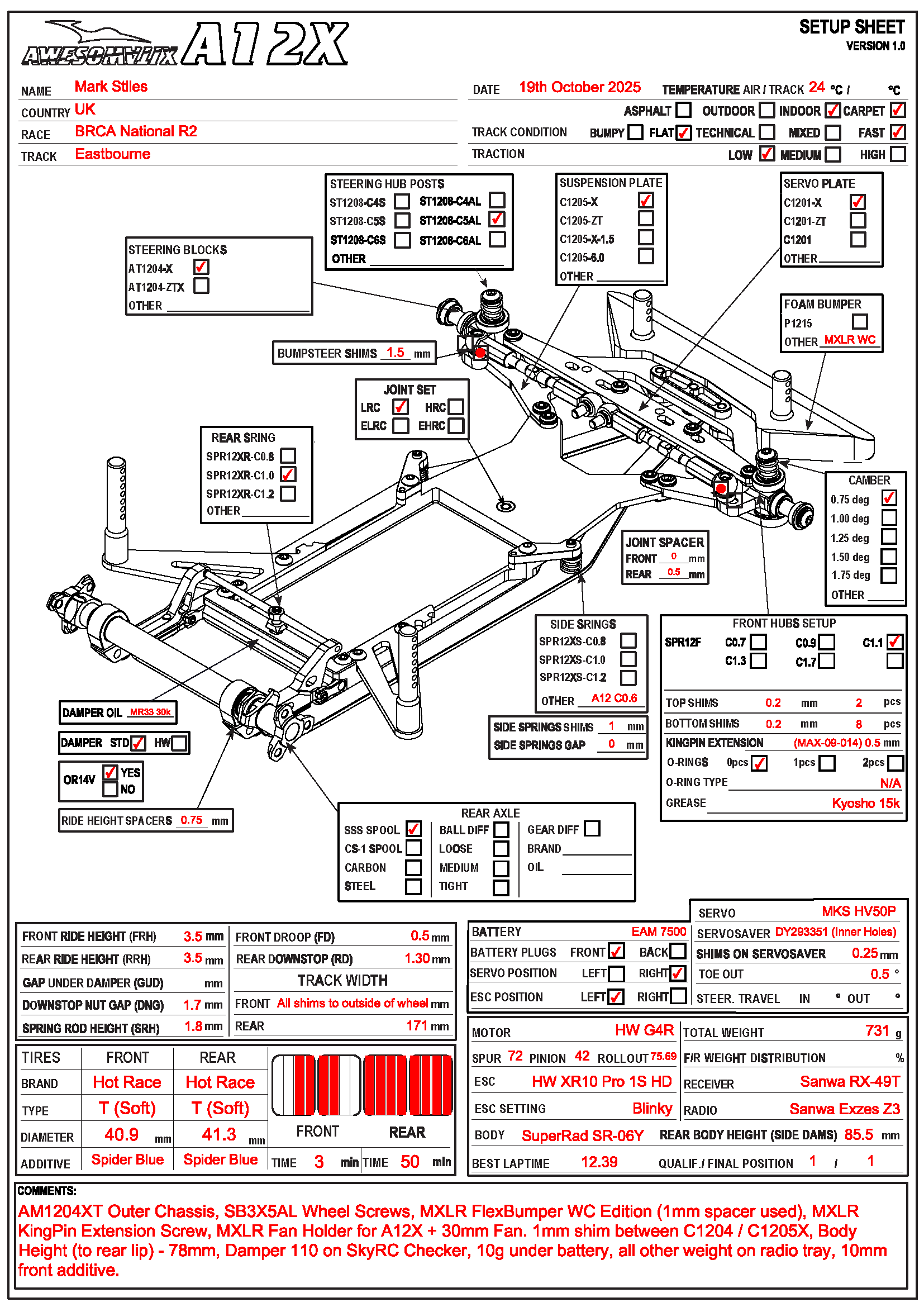 Our weekend down south was for filled with tight margins. Saturdays qualifying came down to the very last round. Previous national champion Mark Stiles had been dominant up to this point winning 2 of the first 3 round of qualfiying , with Schumachers Andy Murray taking one of the early rounds. Marks round 3 time set a high bench mark for the final round of qualifying where it seemed like anyone could snatch the top spot from him. However it was a shock TQ in round 4 for Chase Mackman who missed out on overall TQ by just 0.05. Awesomatix filled the front row of the grid. While Louis Parker found himself 3rd with Micheal Bolt and Matthieau Dambrine 4th and 5th . An impressive display from Mattheau on what was only his second national round. A mistake late on in the final round of qualifying denied Finely Whitelock of a being a few places higher, he would line up 6th. Adam Mackman would line up 7th with the Schumacher trio of Sam Coult , Andy Murry and James hart rounding of the grid.