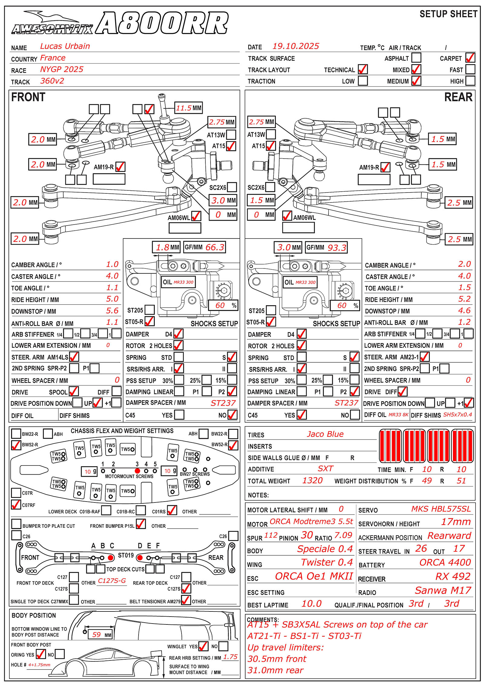 Chassis - Awesomatix A800RR ESC - ORCA OE1 Mark II Motor - ORCA Modtreme 3 5.5T Battery - ORCA Powercore 4400Mah Tires - Jaco (handout) Radio/Servo - Sanwa M17 / MKS HBL575SL Body - Xtreme Twister Speciale