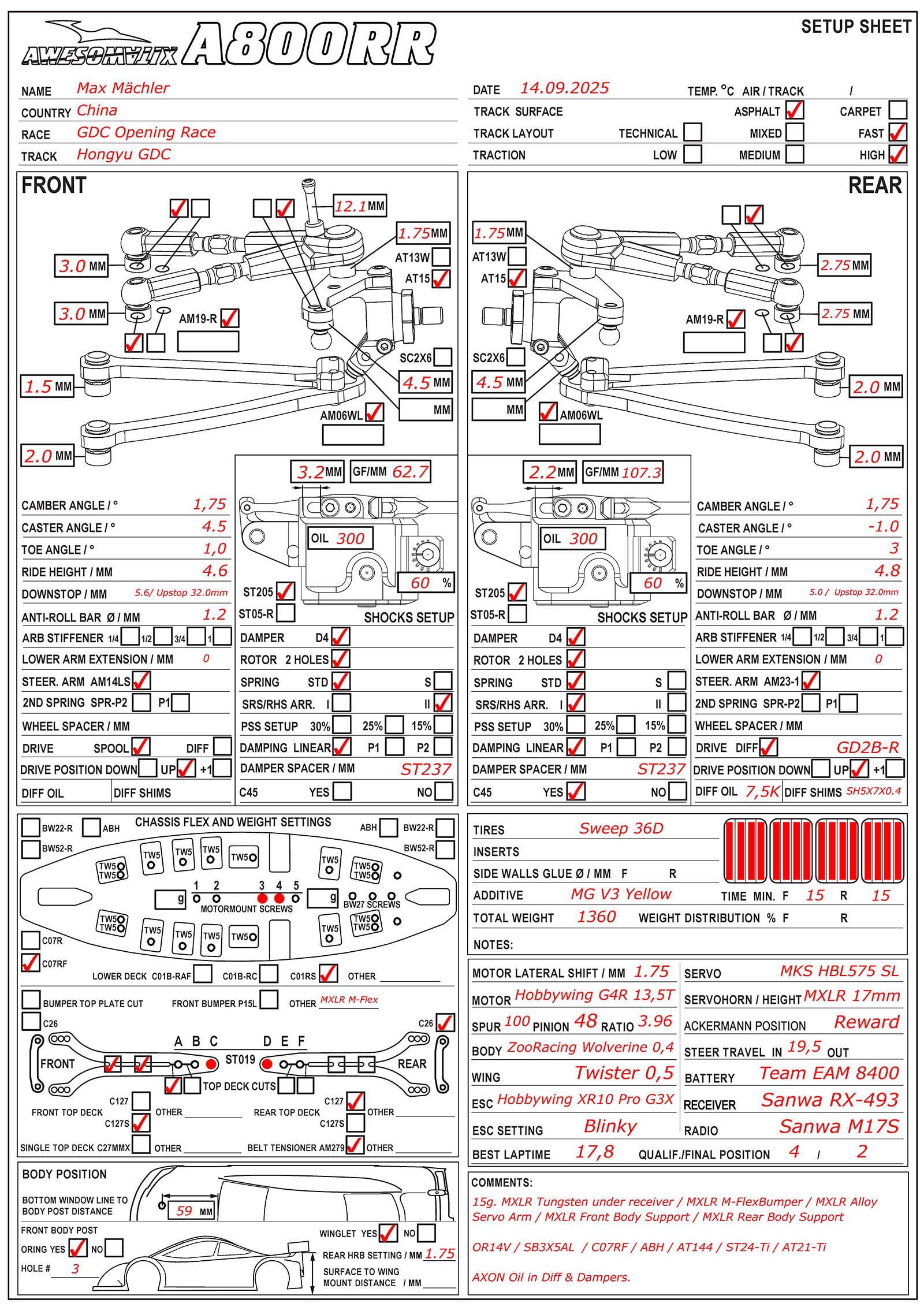 My setup from the opening race at the wonderful GDC outdoor track. The new asphalt is very grippy, without any surface threatment (no suggarwater etc.), and MEGA flat!
