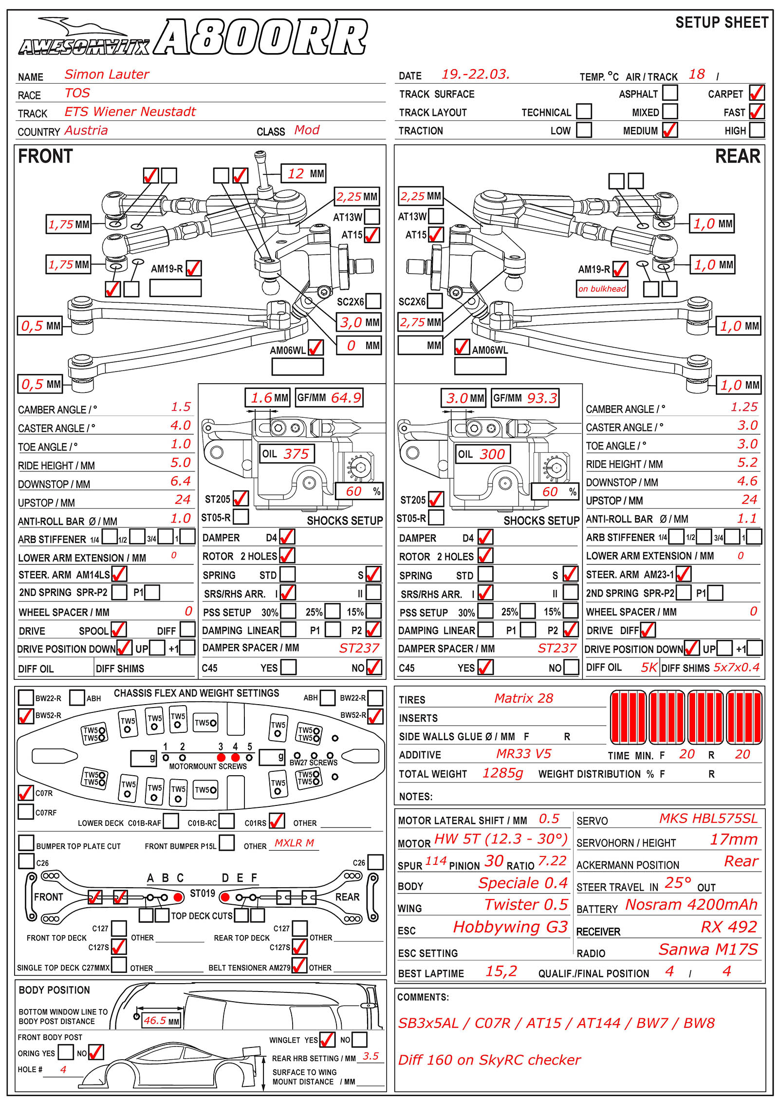 We had a chanct to top off the Xtreme Twister Speciale body shell from Simon Lauter`s car. His A800RR is equipped with the Awesomatix steel chassis, and features the BW55R battery holders to perfectly fix his Nosram 4200mAh shorty battery in the car. Beside of that, Simons car is very close to the standard kit configuration.