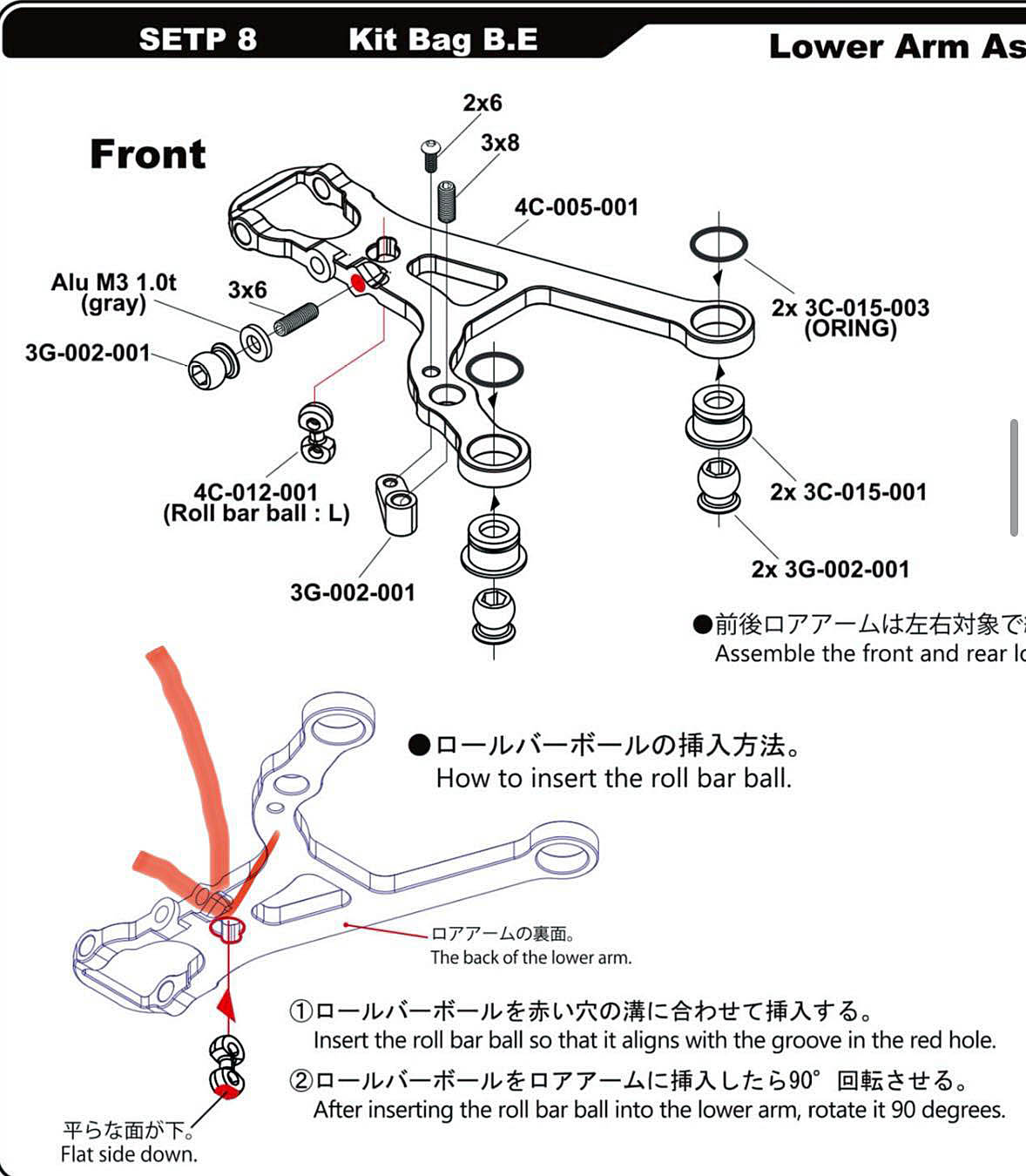 First, insert the roll bar ball into the groove in the suspension arm. Then, align the center of the arm with the center of the ball, then rotate it 90 degrees inside.