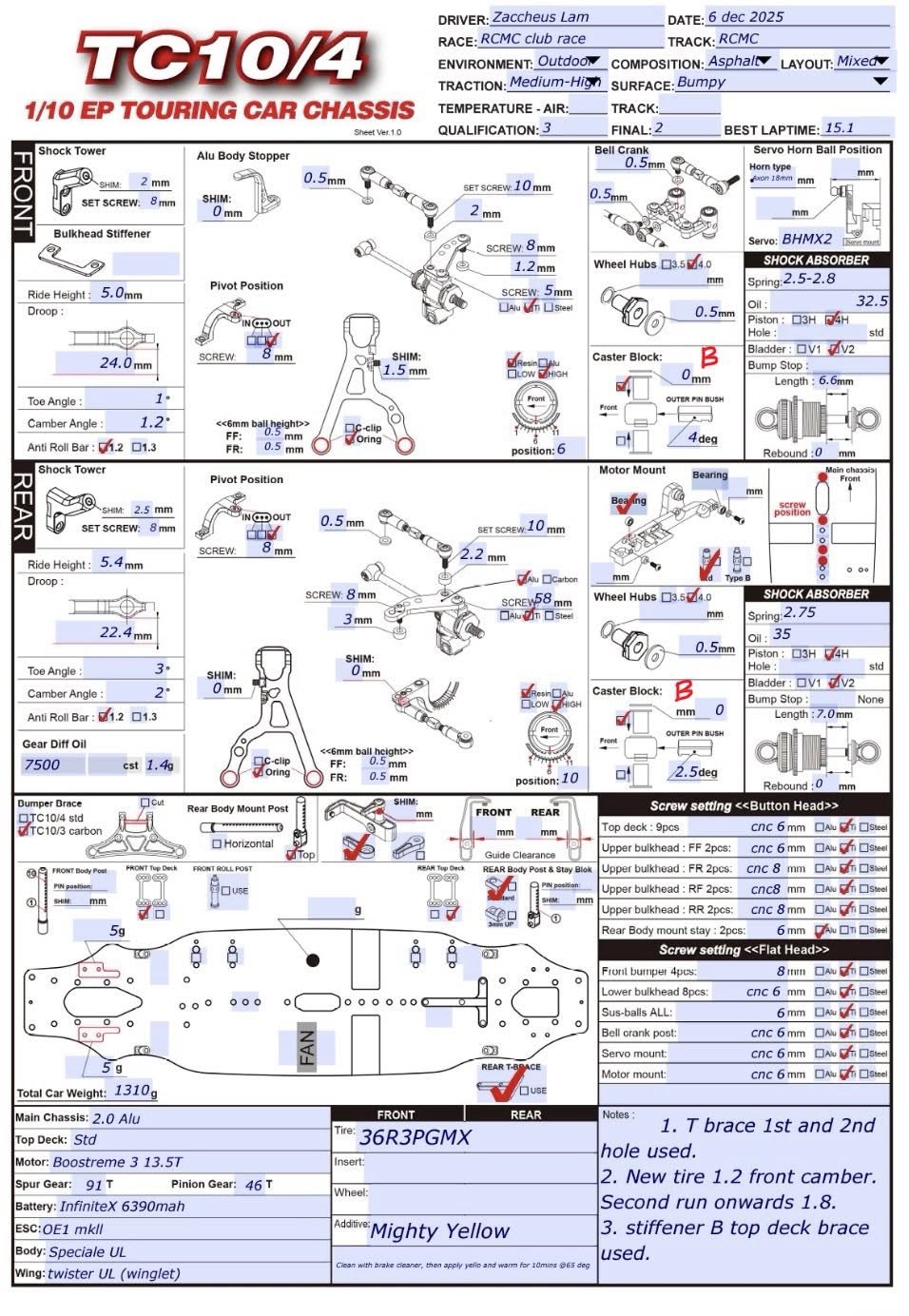 Please do note that my droop values are measured using the MR33 gauge. For those who don't have this tool, the droop measurement from the arms is 7.5 Front and 6.0 Rear.