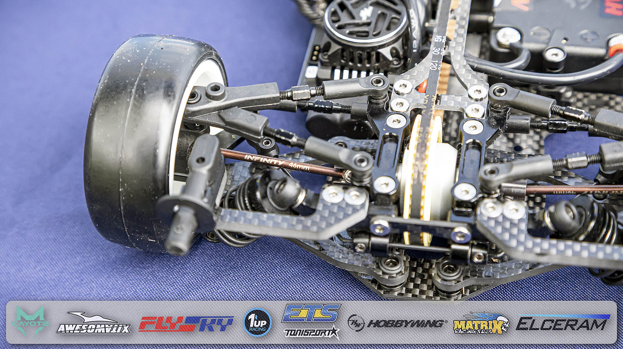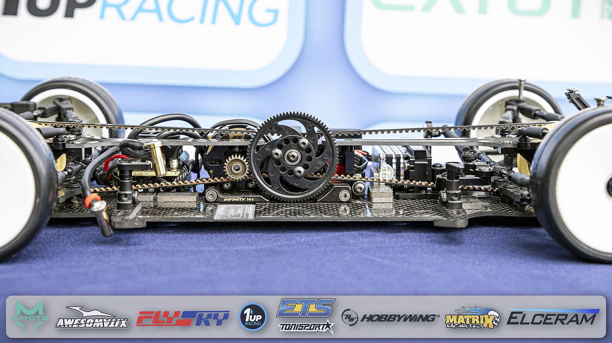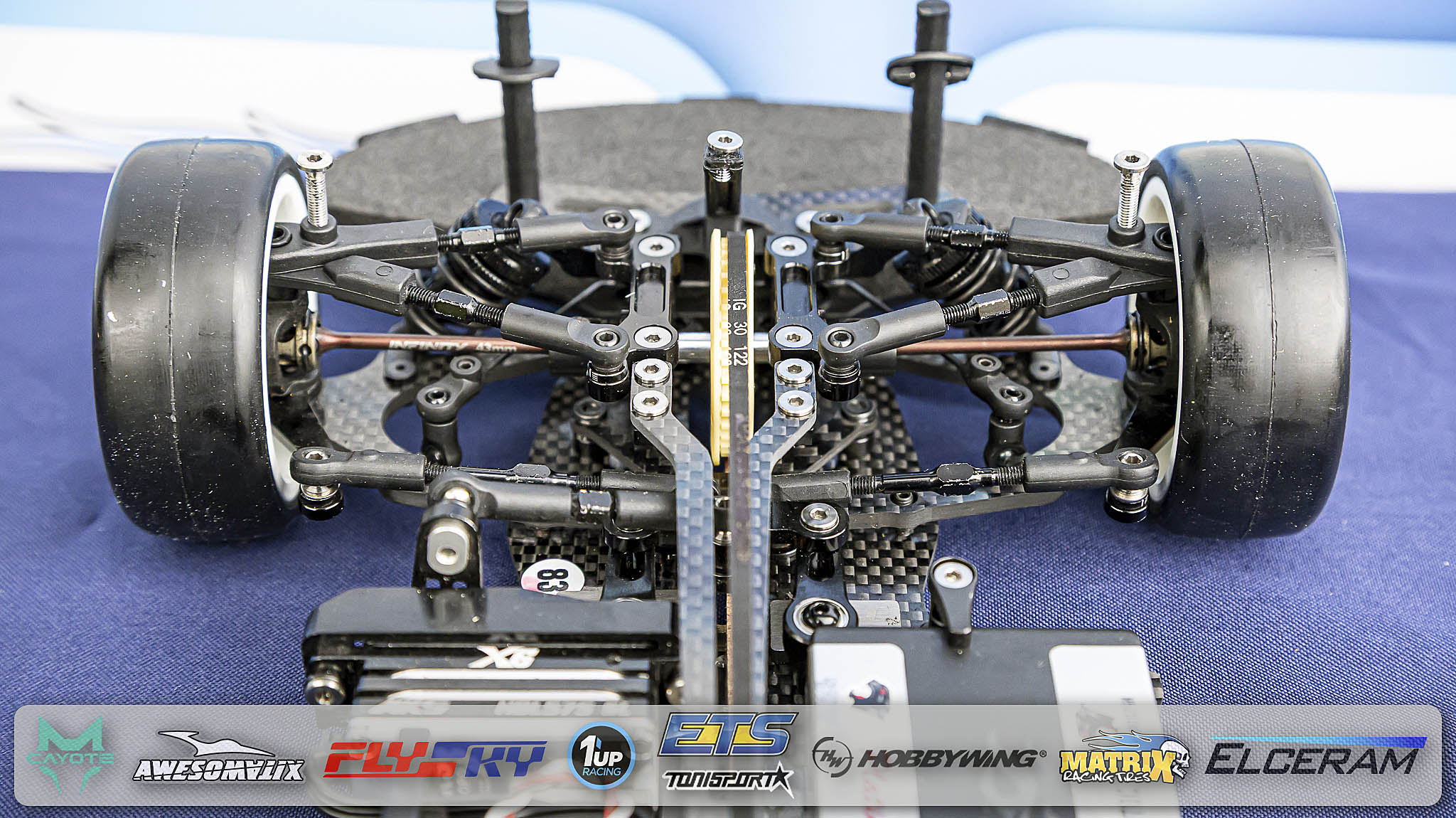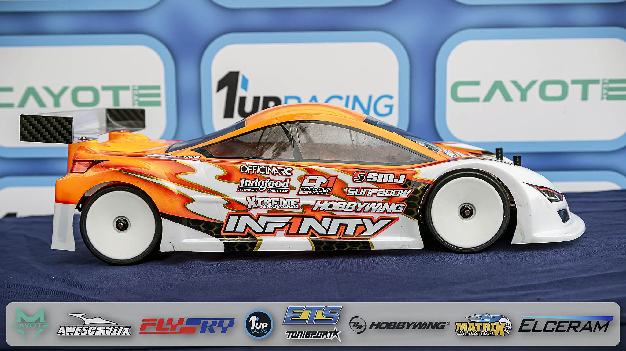 Infinity lead driver Bruno Coelho is running the current IF14 Speciale here at ETS RD3 in Luxembourg. As Bruno said, the car is “as it comes out of the box” with the only option parts being some OfficinaRC screws and SMJ tungsten weights for the perfect balance. The car is also equipped with the lnfinity lF low friction pulleys to make the transmission of the car as smooth as possible. Bruno is very happy with the car so far and is trying “some small changes here and there” to get an even better feeling on track. The IF14 of the reigning world champion is powered by a Hobbywing ESC and 4.5T Motor, energized by Sunpadow 6500 LiPo, and steered by an MKS servo. On the radio side, Bruno is trusting a Futaba T10PX radio and his car is topped of by a DubiDesign painted and DFcreative stickered ultra light Xtreme Twister Speciale 0,4mm body shell in his trademark race paint! Chassis: Inf1nity IF14 Speciale Body Shell: Xtreme Twister Speciale 0,4 Speedo: Hobbywing XeRun XR10 Pro G3 Motor: XeRun V10 G3 4.5T Battery: Sunpadow 6500 Platinum Radio: Futaba T10PX Servo: MKS HBL 575 SL Tires: Matrix ETS Handout Sponsors and support: Inf1nity, Creation Model, SMJ, Hobbywing, Xtreme, Sunpadow, Indofood, MonacoRC, BR1, RCDischarger, DFcreative, DubiDesign |