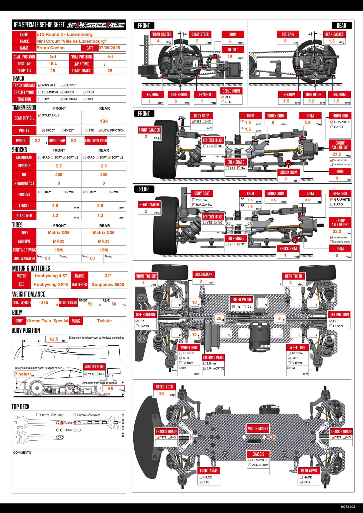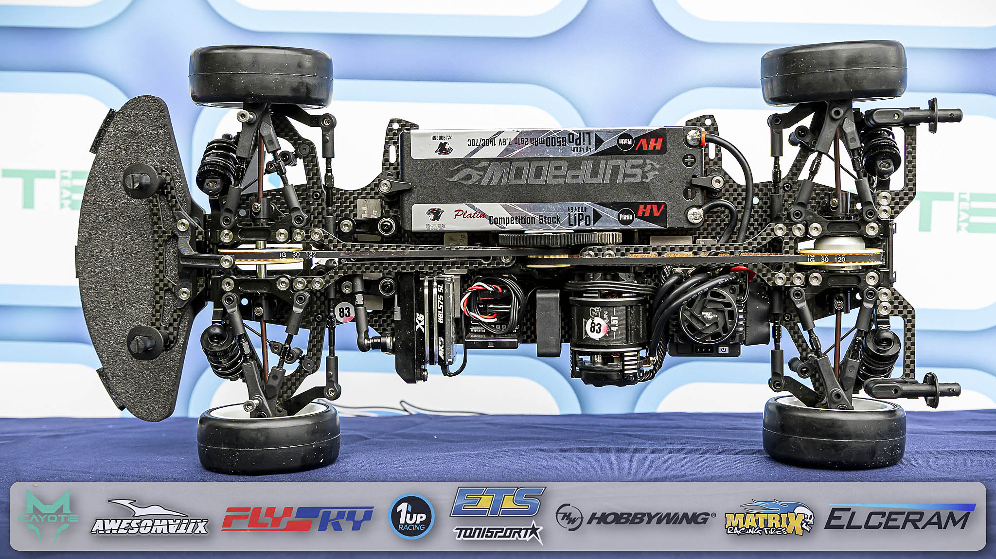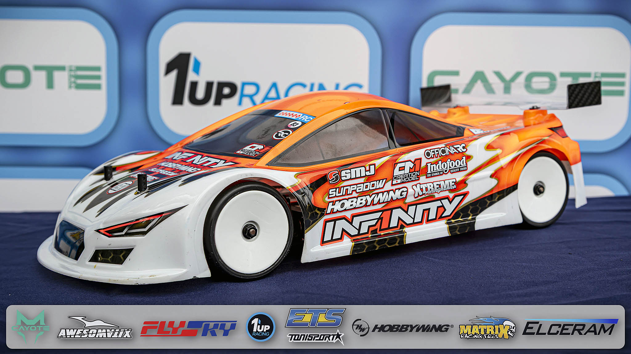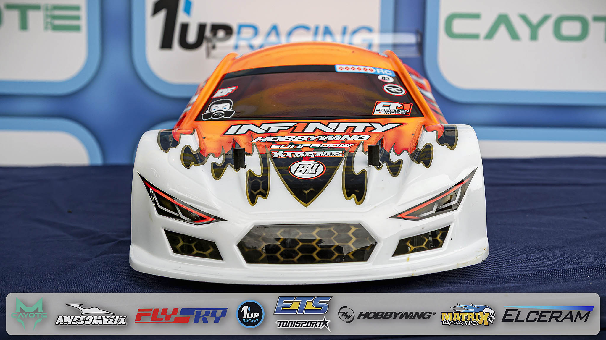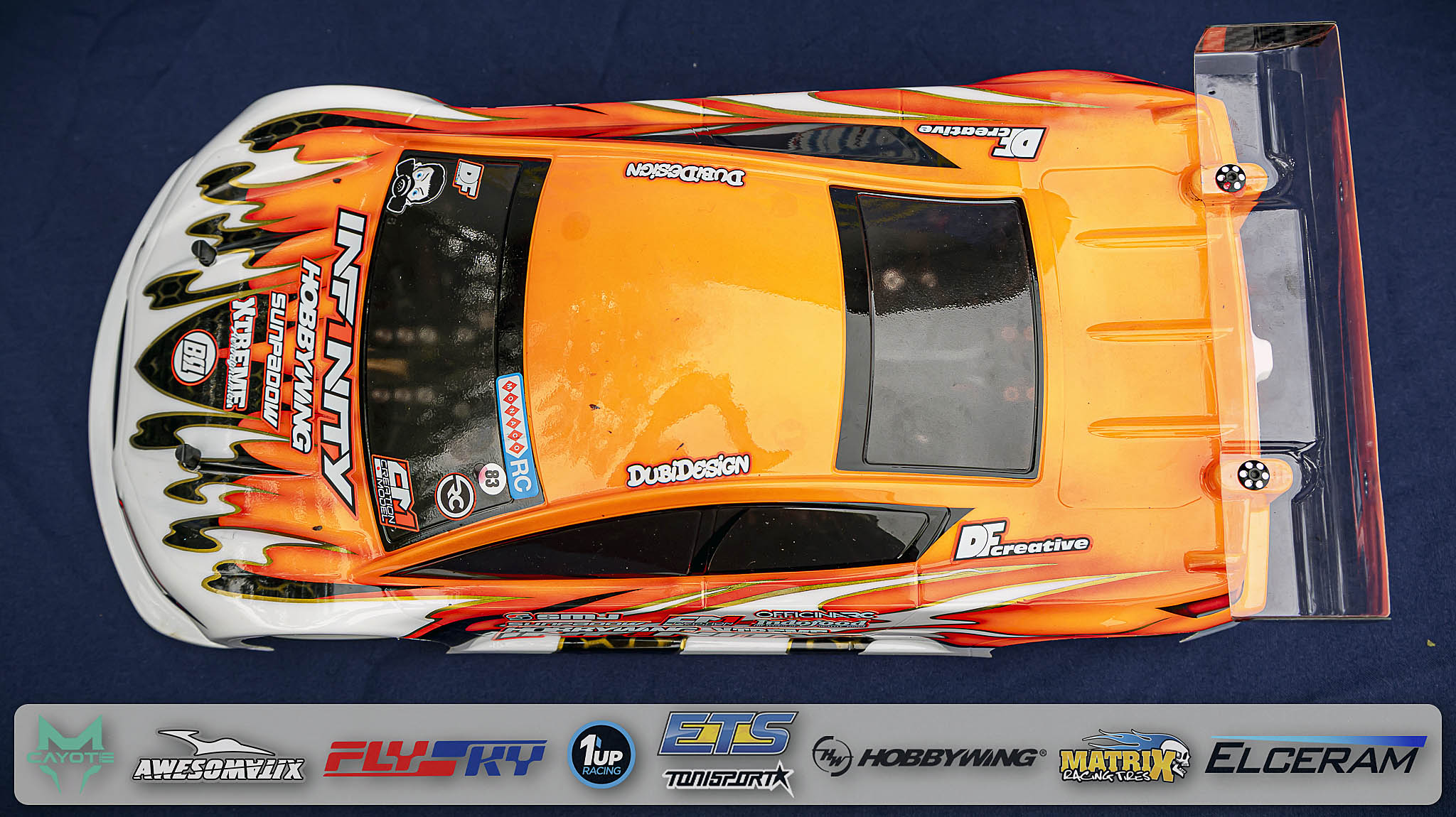 Infinity lead driver Bruno Coelho is running the current IF14 Speciale here at ETS RD3 in Luxembourg. As Bruno said, the car is “as it comes out of the box” with the only option parts being some OfficinaRC screws and SMJ tungsten weights for the perfect balance. The car is also equipped with the lnfinity lF low friction pulleys to make the transmission of the car as smooth as possible. Bruno is very happy with the car so far and is trying “some small changes here and there” to get an even better feeling on track. The IF14 of the reigning world champion is powered by a Hobbywing ESC and 4.5T Motor, energized by Sunpadow 6500 LiPo, and steered by an MKS servo. On the radio side, Bruno is trusting a Futaba T10PX radio and his car is topped of by a DubiDesign painted and DFcreative stickered ultra light Xtreme Twister Speciale 0,4mm body shell in his trademark race paint! Chassis: Inf1nity IF14 Speciale Body Shell: Xtreme Twister Speciale 0,4 Speedo: Hobbywing XeRun XR10 Pro G3 Motor: XeRun V10 G3 4.5T Battery: Sunpadow 6500 Platinum Radio: Futaba T10PX Servo: MKS HBL 575 SL Tires: Matrix ETS Handout Sponsors and support: Inf1nity, Creation Model, SMJ, Hobbywing, Xtreme, Sunpadow, Indofood, MonacoRC, BR1, RCDischarger, DFcreative, DubiDesign |