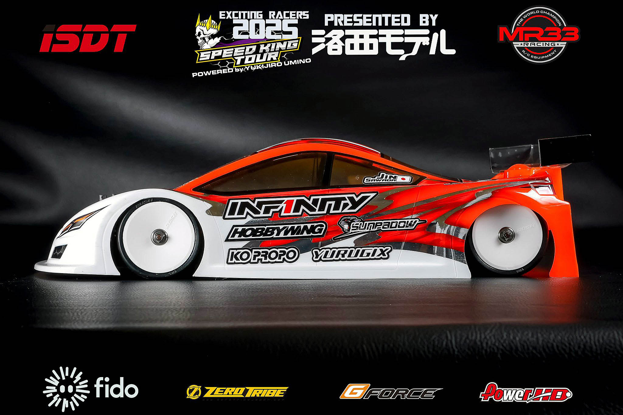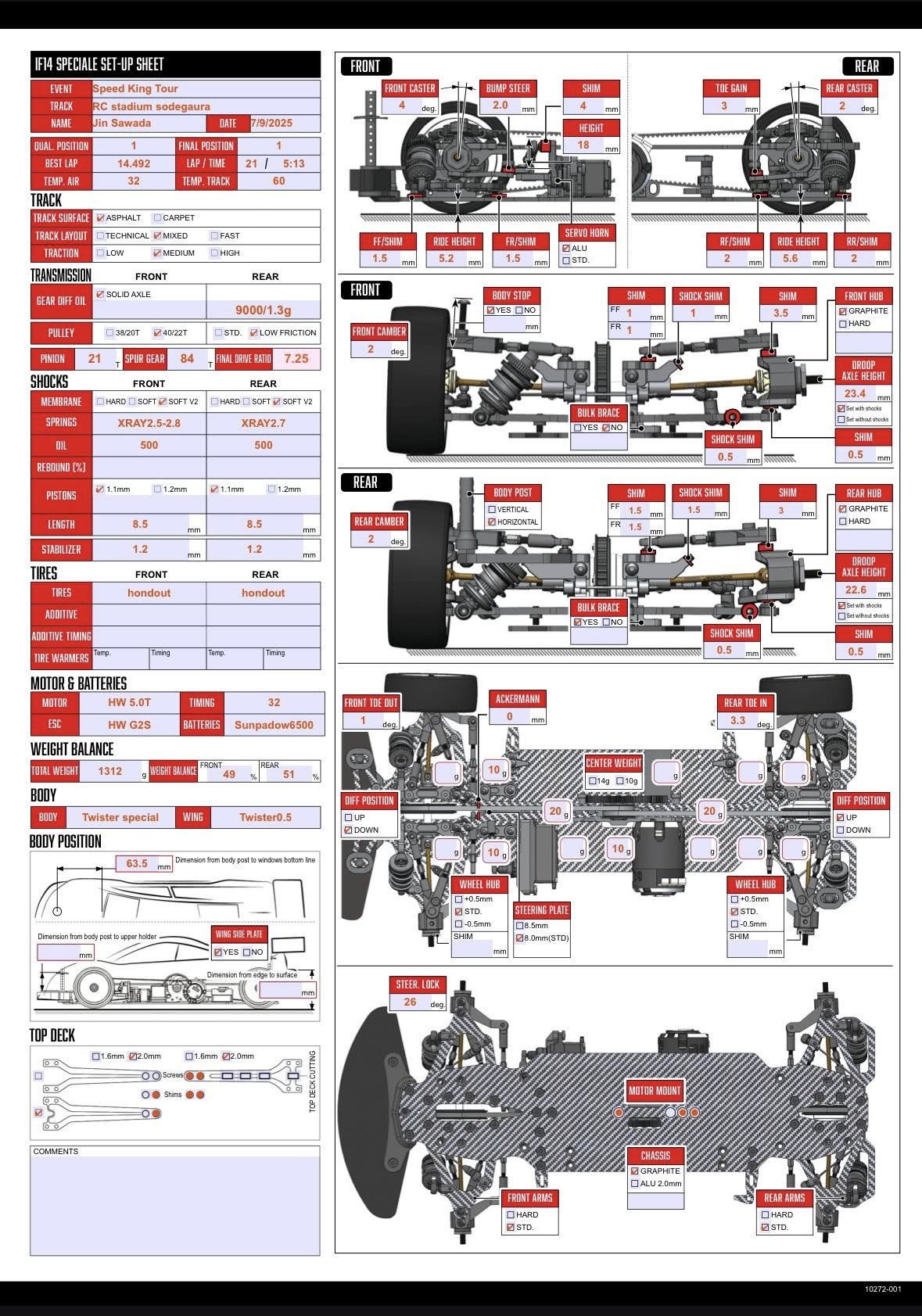 Chassis – Infinity IF14 SPECIALE ESC – Hobbywing XR10 G3 Motor – Hobbywing V10 G3 5T Battery – Sunpadow 6500 mAh Tires – RUSH (handout) Radio-SANWA M17S Servo –SANWA LH-R Body – Xtreme Twister Speciale