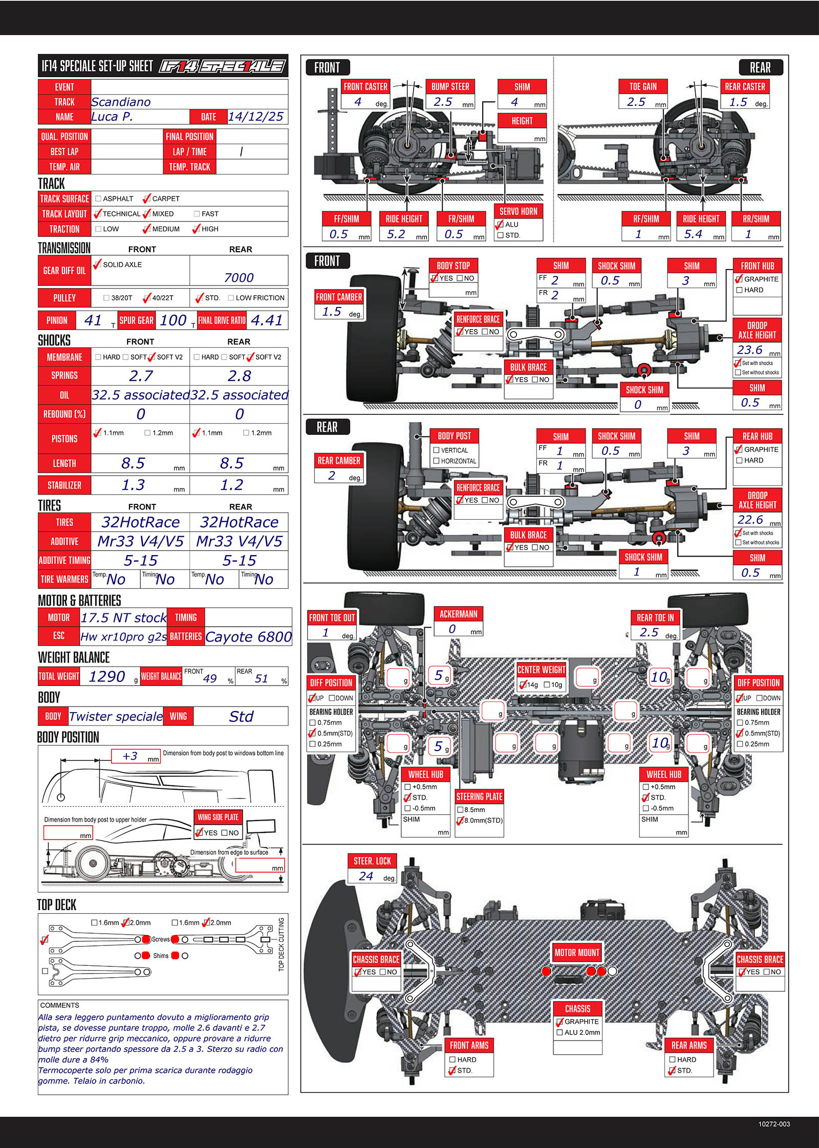 In the evening slight aiming due to improved track grip, if it should point too much, springs 2.6 front and 2.7 rear to reduce mechanical grip, or try to reduce bump steer by bringing thickness from 2.5 to 3.