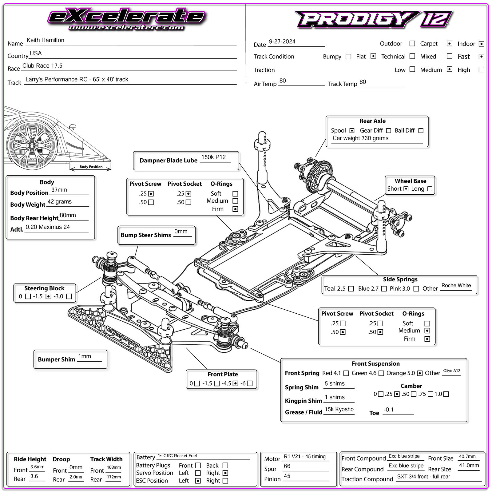 The major change from two weeks ago was trying the -4.5 plate with -1.5 steering blocks. Tim stayed with the kit 0 plate and -3 blocks and worked to test the new P12 damper fluids, some springs, and the new medium downforce body. The new parts on my P12 made the wheelbase the same as my A12 with -6 plate and in-line steering blocks. I liked the new parts but did lose some corner entry speed. Mid corner to exit was more balanced.