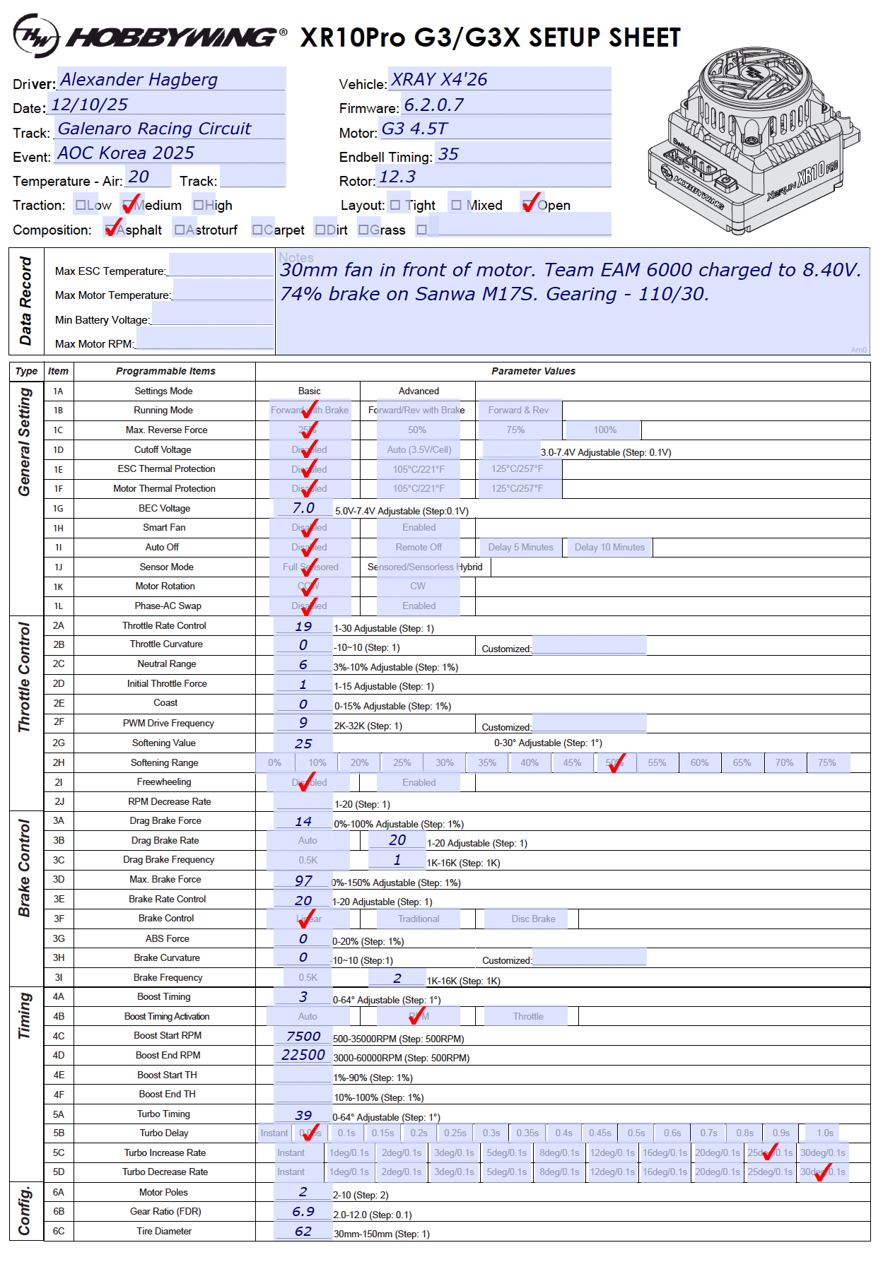 My Hobbywing Technology G3 XR10 PRO & G3 4.5T set-up sheet from the recent Asian Onroad Championships - AOC!
