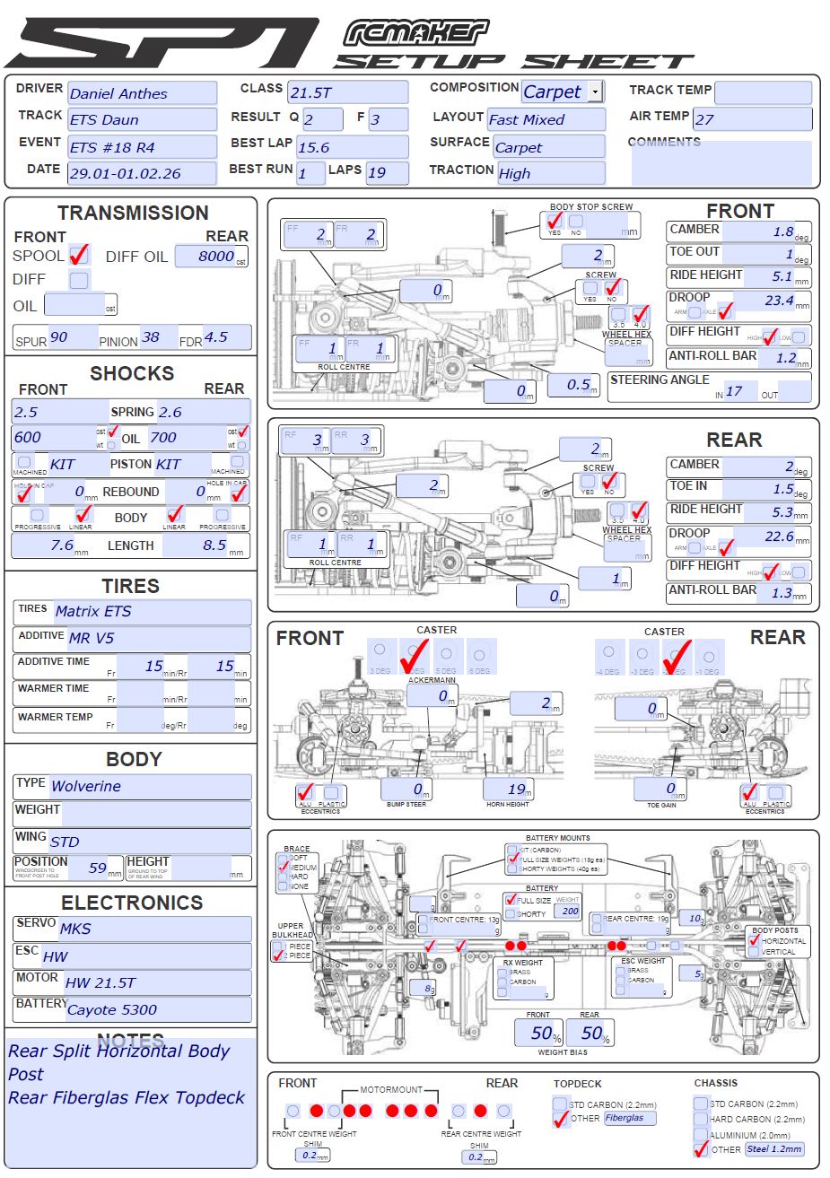 Front Topdeck 2.2mm Carbon with the cuts, rear is fiberglas, forgot to add that. Setup was pretty agressive in the front, rear was stable enough like that.