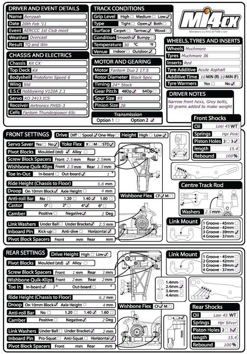 - Schumacher MI4CX - Benzaah - AERCCC - Club Meeting - 20.02.2011 - My 1st Club meet today with the new car getting and off to a great start with the Tq and Win. I didn't have the fastest car as we have a new track lay out and I was playing with the HW settings but its such an easy car to drive consistently no one could close in. My best con of the day was First qualifier where I pulled 0.19 so I was super stoked. Source: