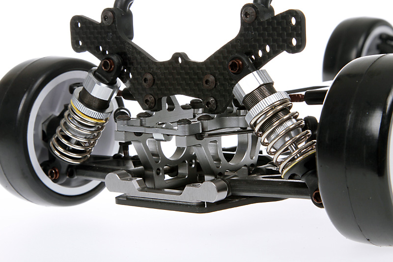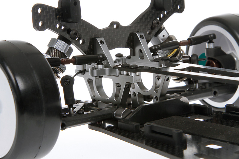 The front and rear uses machined aluminium suspension brackets for a super stabile and smooth drive. Shims are used to change wheelbase. The strong spring-steel pivotpins pivot on steel balls captured in the suspension brackets for supersmooth action.
