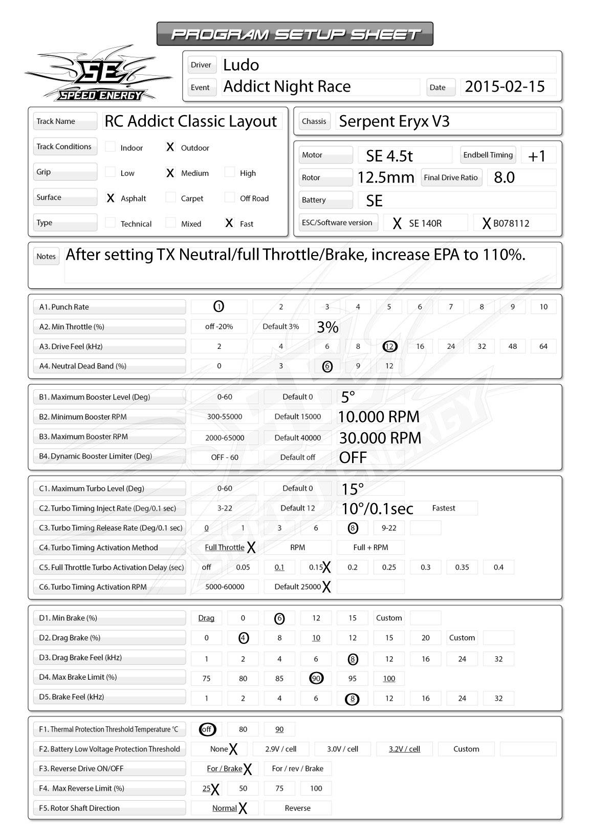 TITC '15 Practice in on the way! For Speed Energy ESC 140R Users in Modfified Class, here is a set-up to start with. Increase Turbo Timing as you see fit. Big Motor FAN highly recommended !