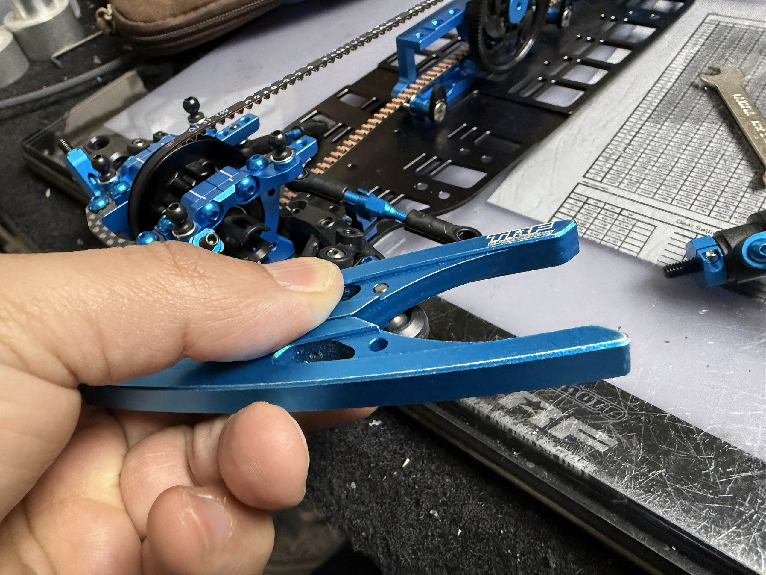 Generally speaking, the time for carbon main chassis is over! With loads of back-to-back tests on the TRF421, I came to the conclusion that Alu is always the better way. Regarding steel, I am still not 100% convinced. On some tracks, it might have some benefits – while on others, with Alu, everything is fine. In the end, it’s a matter of personal taste.