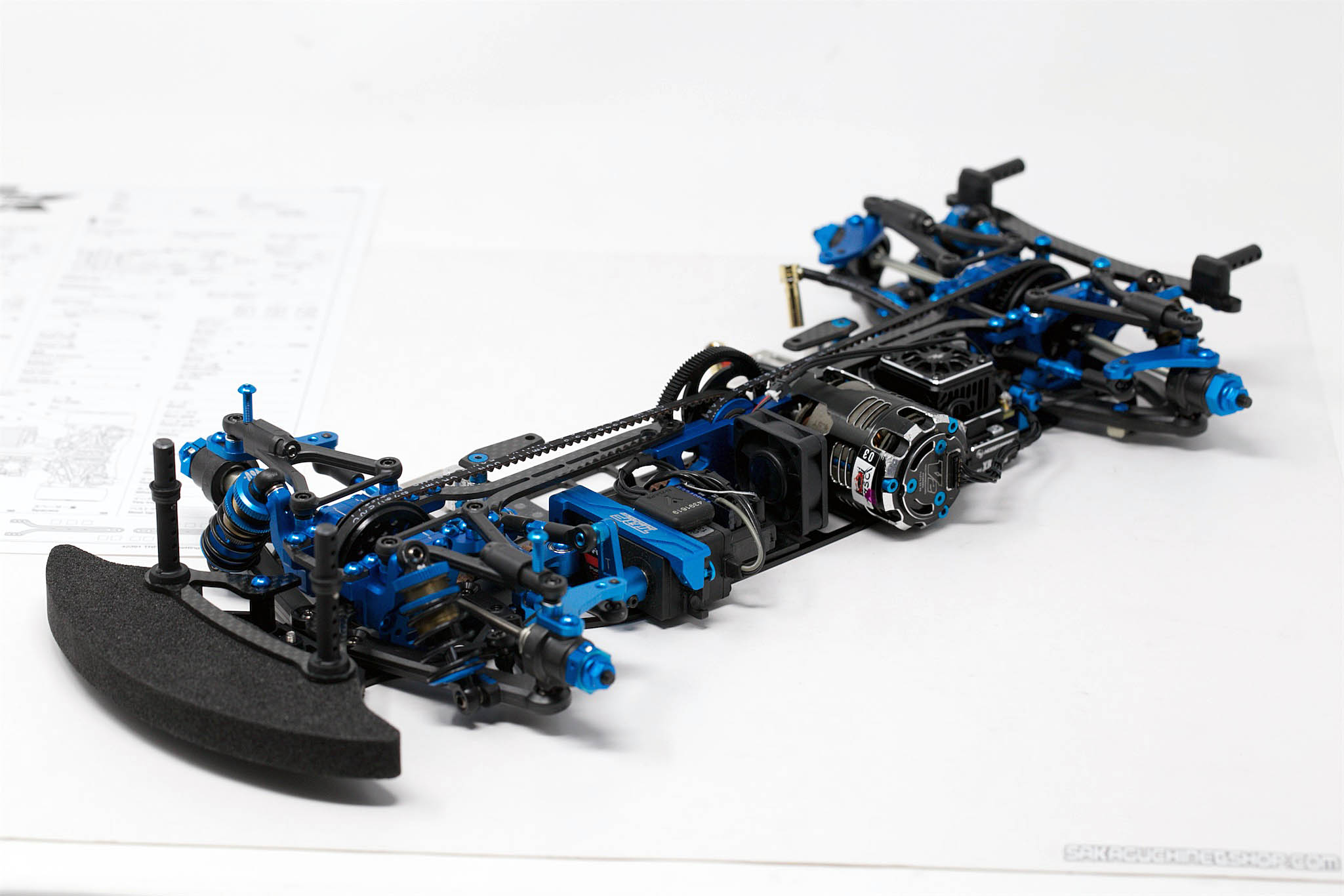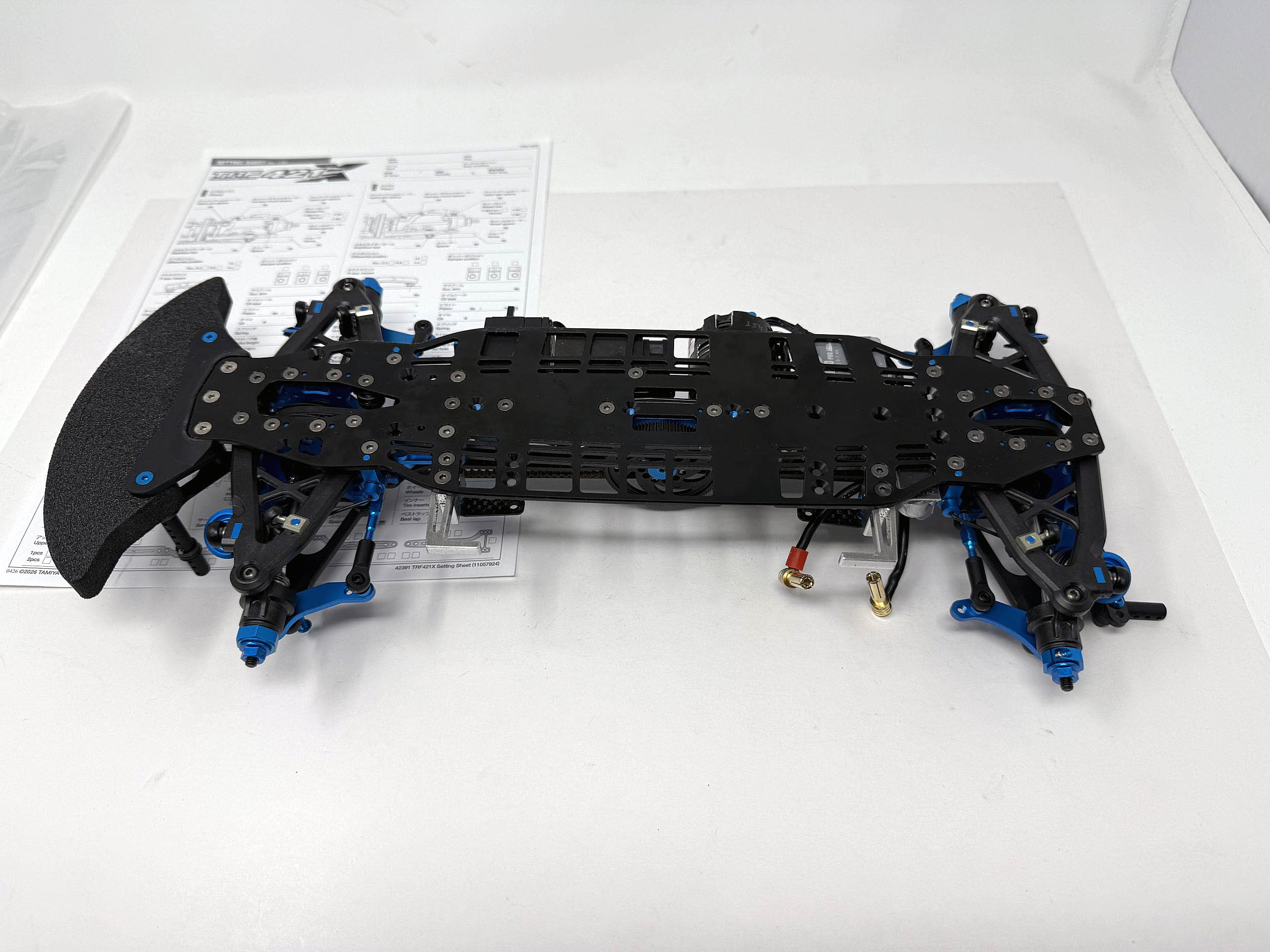 Used Hop Ups / Tweaks: – Square STM-90 TRF421 Alu / S-Flex Titanium Screw Set Sakaguchinetshop Special Edition (some sizes were replaced by other sizes) – Axon ST-HL-013 “Red” Springs on Front & Rear (for more easy setup I still recommend ST-HP-013 on front and ST-SL-013 on rear). – Tamiya #13404136 Carbon Battery Holders (2 pcs.) – Prototype Alu Battery Holder – Tamiya #19803493 Front Knuckle Plates from TRF421 (for shorter Turnbuckle length) – Square NAR-314TB (2 pcs.) Alu Screws for Body Lift on front upper suspension arms – Axon PG-BS-001 Front Lightweight Body Mount Spacers – Axon DB-NB-105 Precision Shock Bladder V2 Type Flex NBR (better fit than #51738) – Tamiya #42248 Alu Servo Horn – Axon GS-T6B-111 Spur Gear (for Modified 4.5T Motor) – Axon GP-A6-028 Pinion Gear (for Modified 4.5T Motor) – Axon AC-BS-001 Clear Battery Tape (more friction between battery and main chassis)