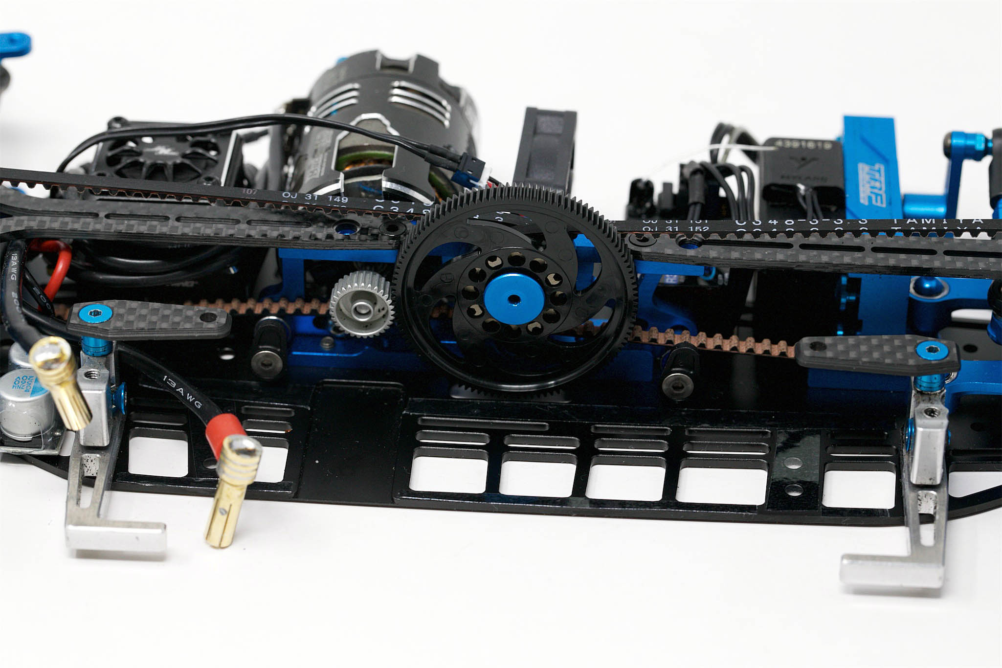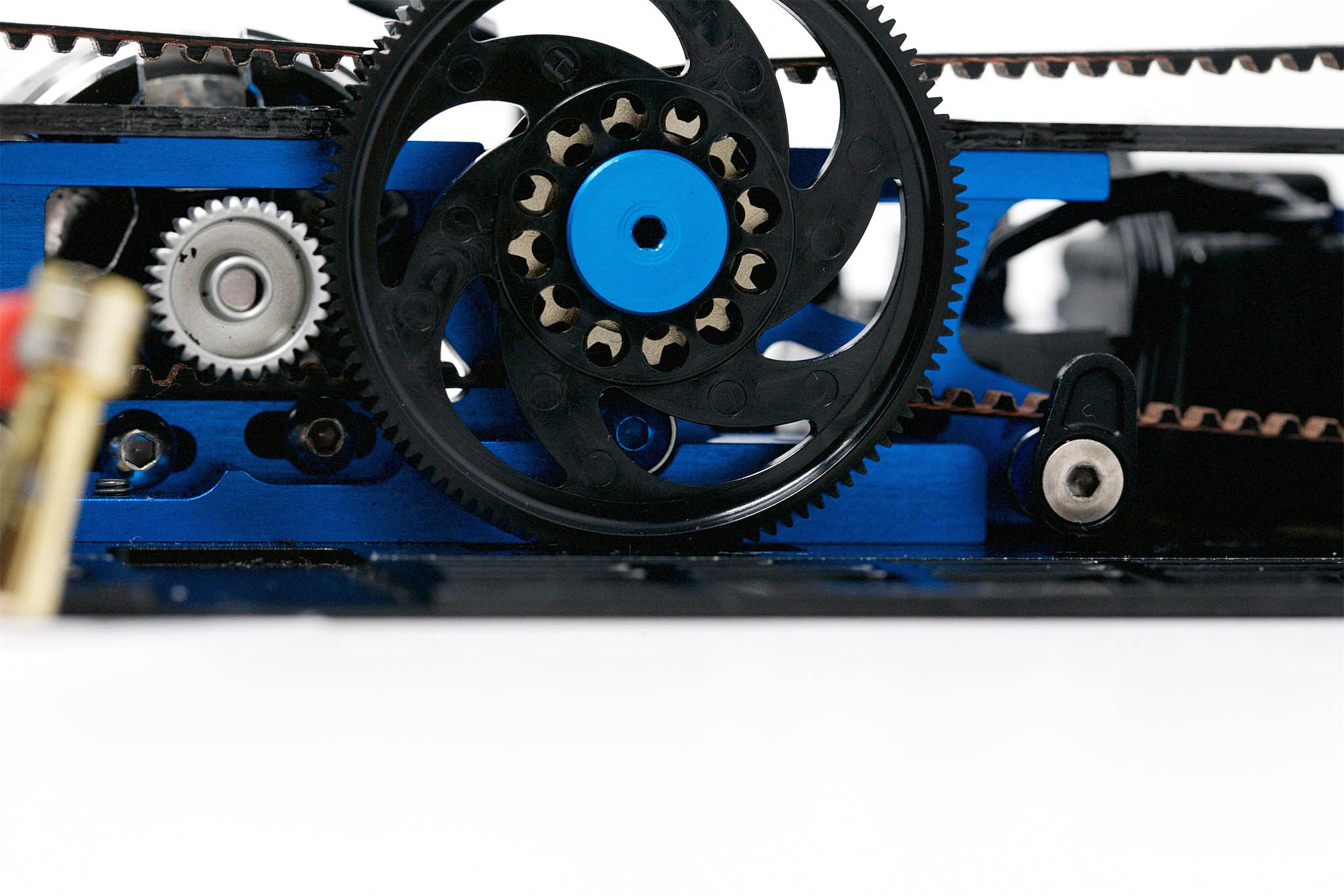 – Underneath the centre pulley, there is now a ball bearing preventing a slip of the rear belt. So in general (especially for stock racers), the rear belt tension can be set to lower settings and have less drag.