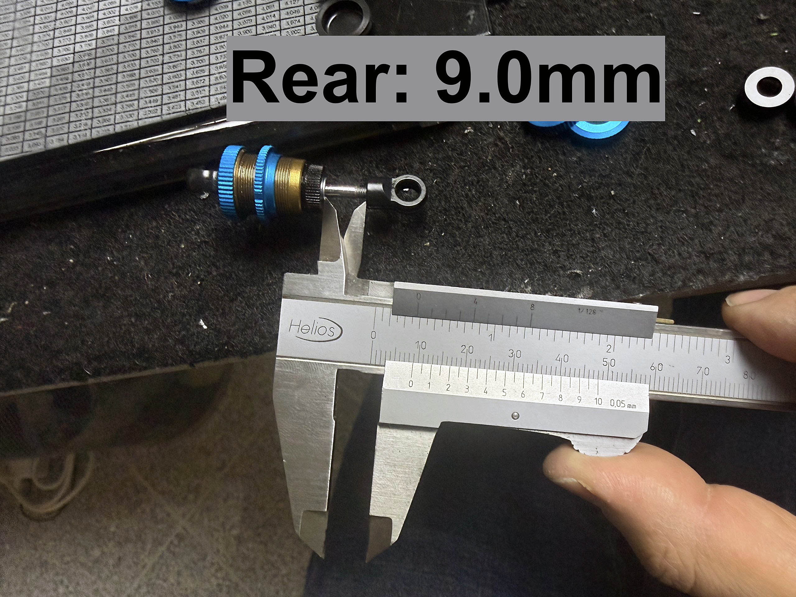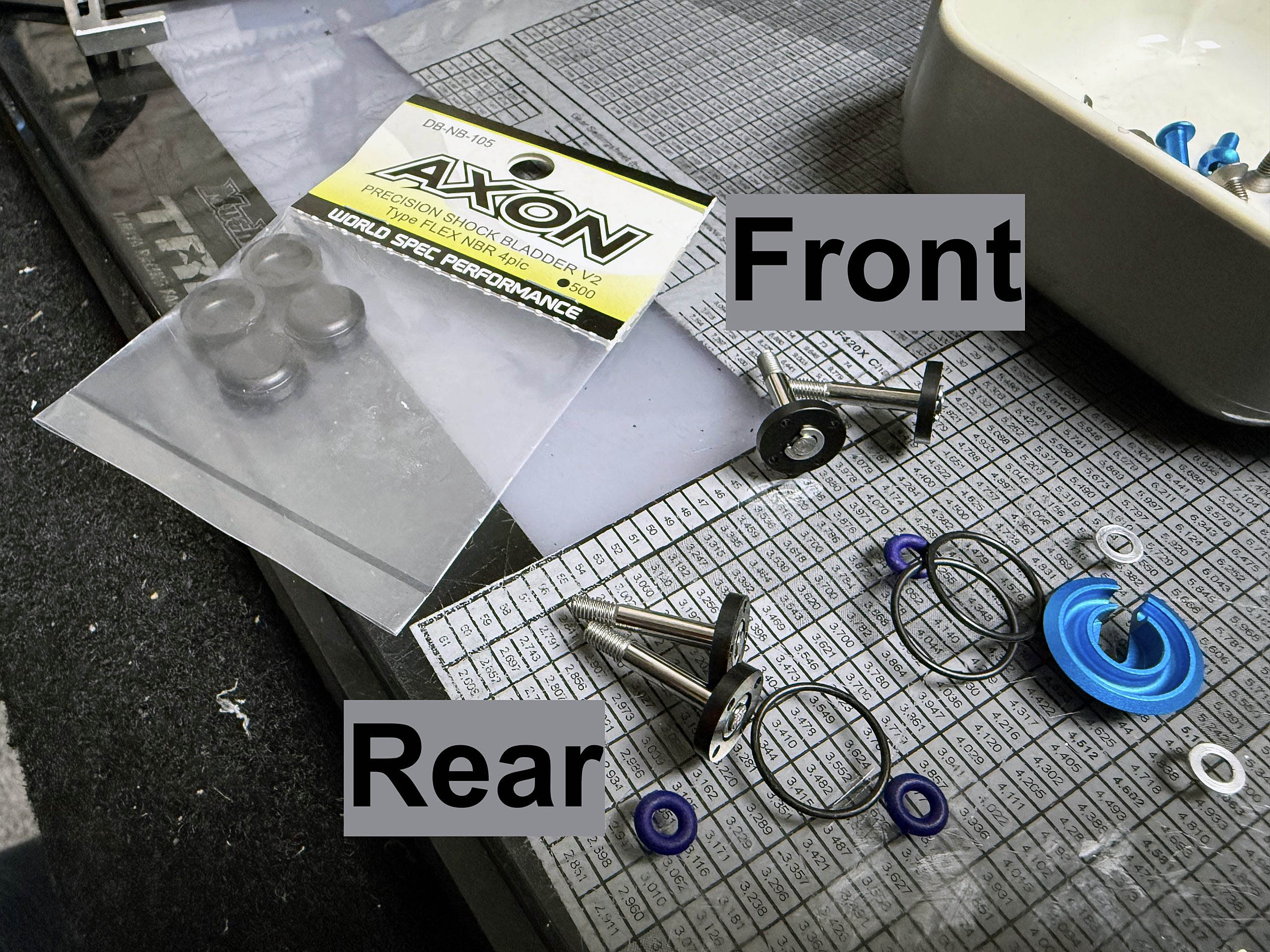 After many tests on TRF421, I came to the conclusion that Axon DB-NB-105 Shock Bladders fit way better than the original #51738 ones, which occasionally are a bit too small and were soaked into the main damper body after some runs (this happens only on some dampers!). The Axon ones are higher and fit the USBB dampers just perfectly! Don’t forget to make the 1mm air bleeding hole into the top shock caps. Like on the TRF421, I recommend turning the rear damper pistons to prevent a suction effect when riding low droop settings on the rear (below 4mm). Damper length was adjusted to 7.4mm on the front and 9.0mm on the rear using the kit-recommended lower eyelets.