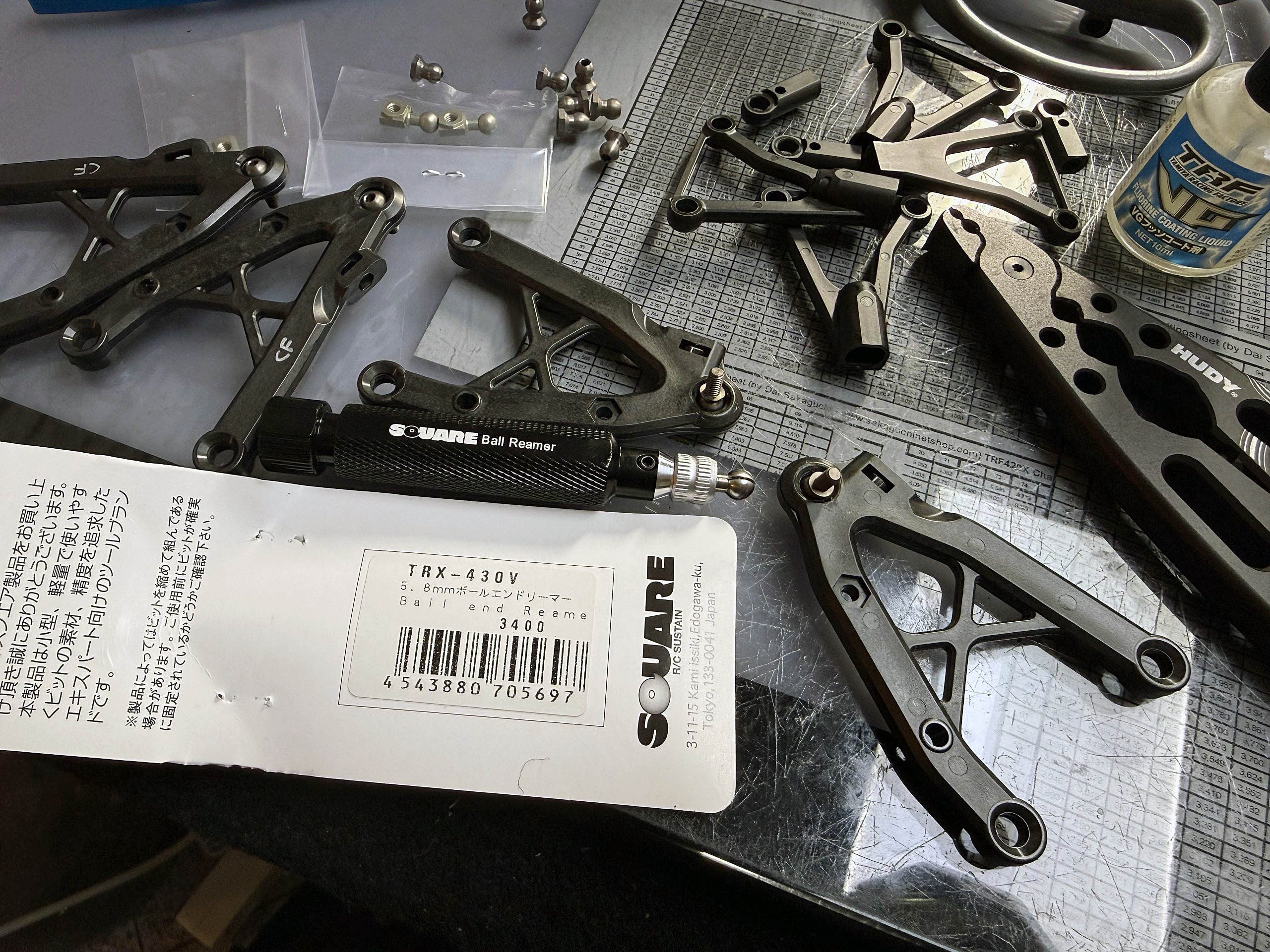 Relating the build-up: The first thing I noticed is the changed damper mounting position on the lower arms. They went quite a bit more towards inside. That matches also the fact that the upper damper stays to accommodate the dampers more close to the chassis. In my opinion, the outer 5.8mm ball fittings in the lower suspension arms are a bit too tight. With a Square TRX-430V 5.8mm Ball End Reamer, I have ground just a bit of material off, and the fit was perfect. With the help of #42276 TRF Damper Pliers, it was a bit more easy to press in the 5.8mm Balls into the suspension arms, as they have some 3mm holes to accommodate the balls perfectly.