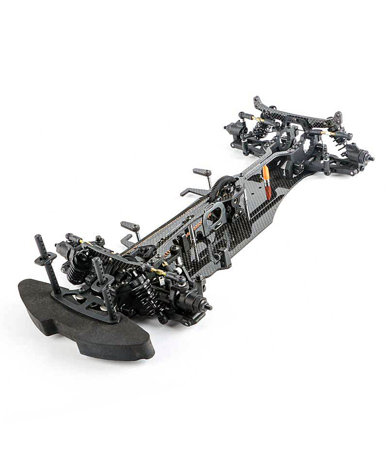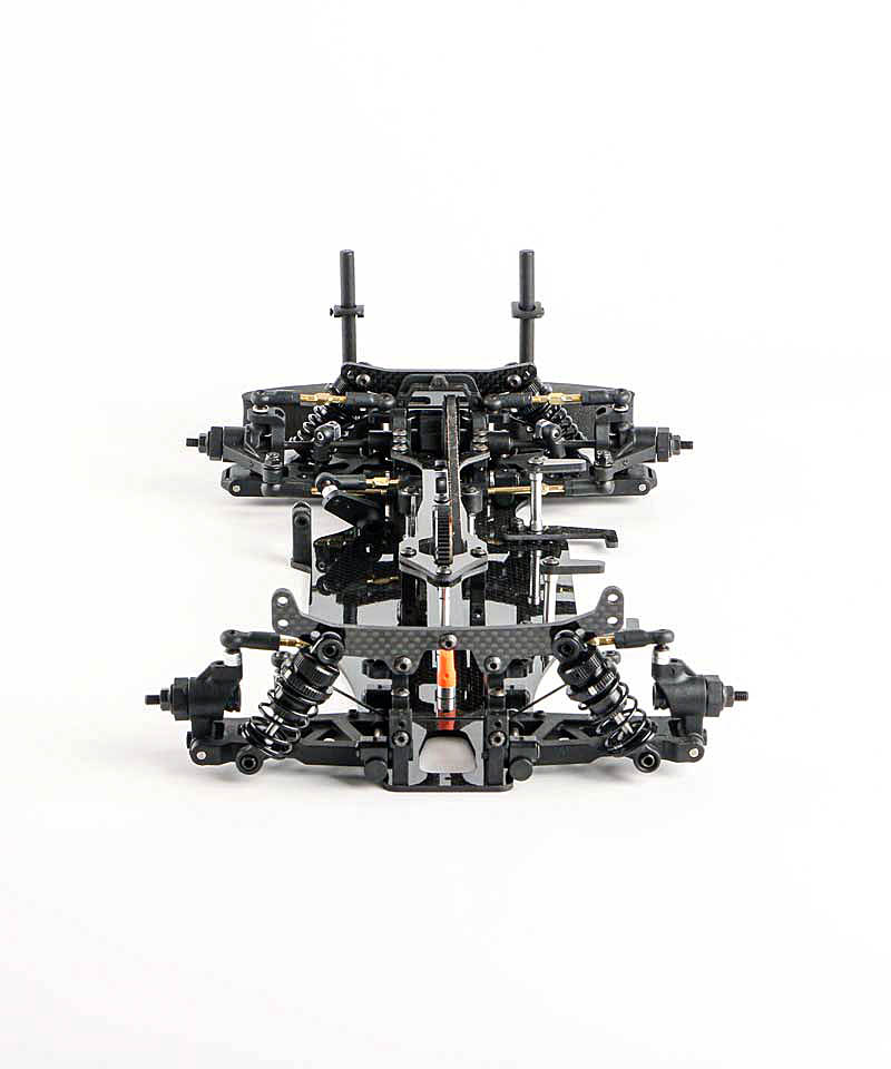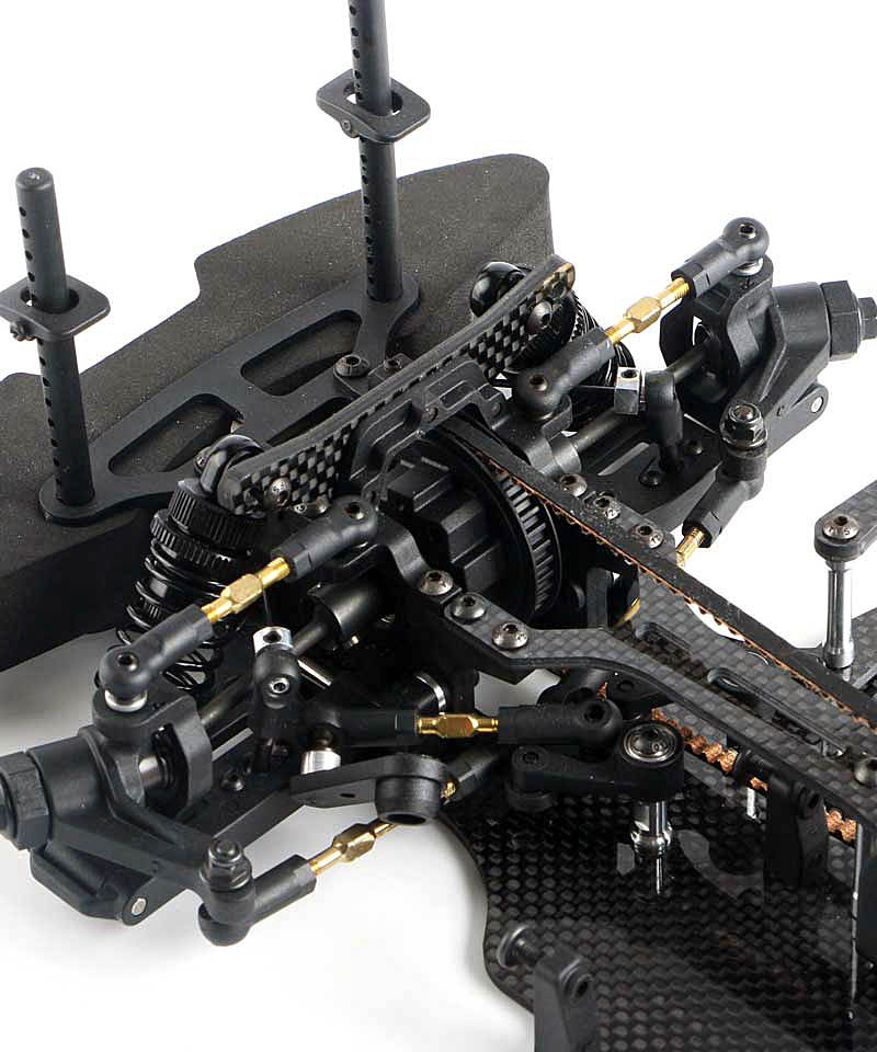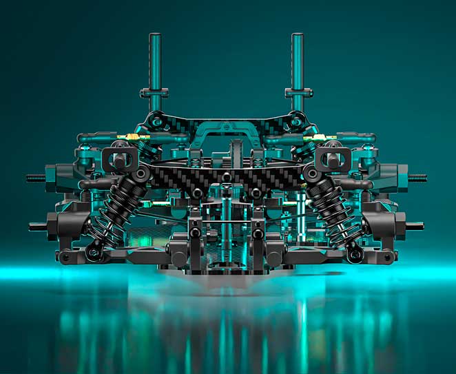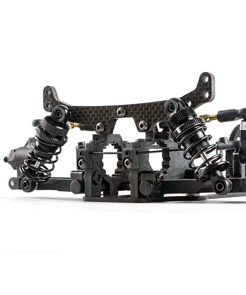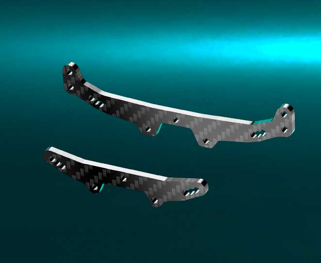 The shock towers made of 3.0mm ECO-Graphite serve as the chassis and upper deck, with multiple setting holes for optimal placement of shock absorbers to enhance performance based on track conditions.