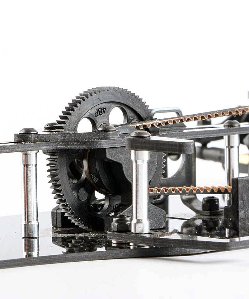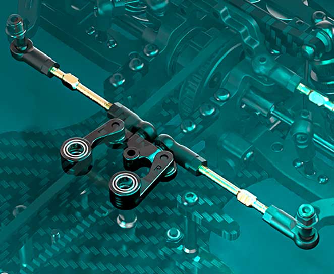 Hard plastic material is used for the steering bell crank to ensure rigidity, while ball bearings are used on both steering arms and the central link for ultra-fast and precise steering movement without any hard points.