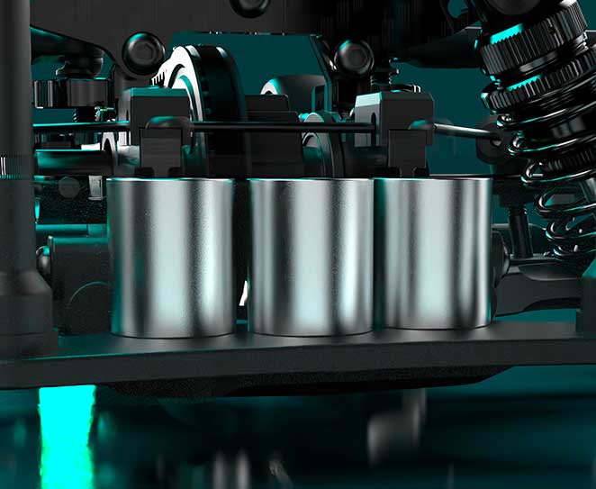 Ultra-low CG big bore design, Teflon-coated shock bodies, and polished/hardened shock shafts for smooth movement.