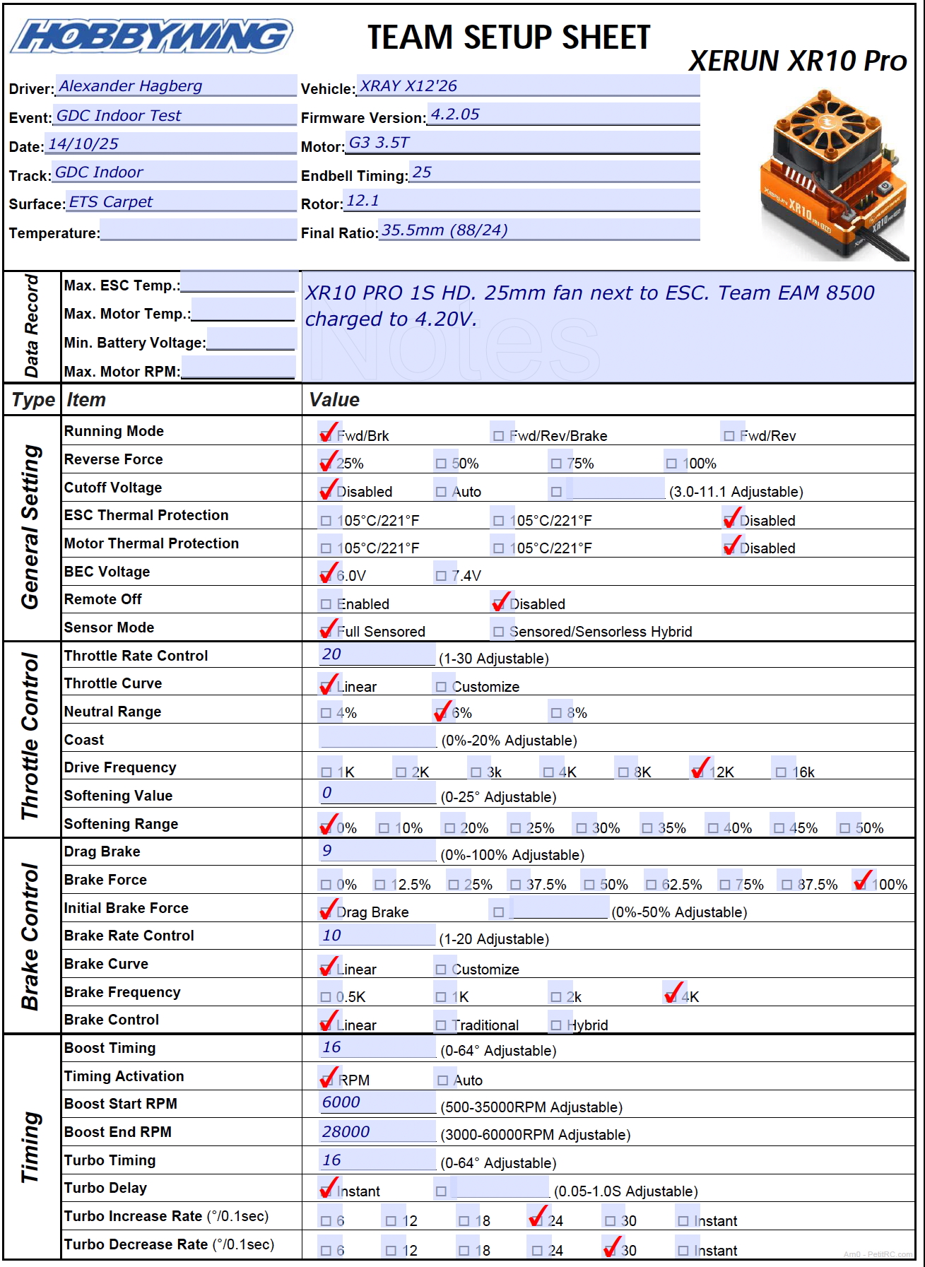 The car handled brilliantly from the first lap and was a true joy to drive! I hereby attach my set-up sheets for both car and Hobbywing Technology electronics!