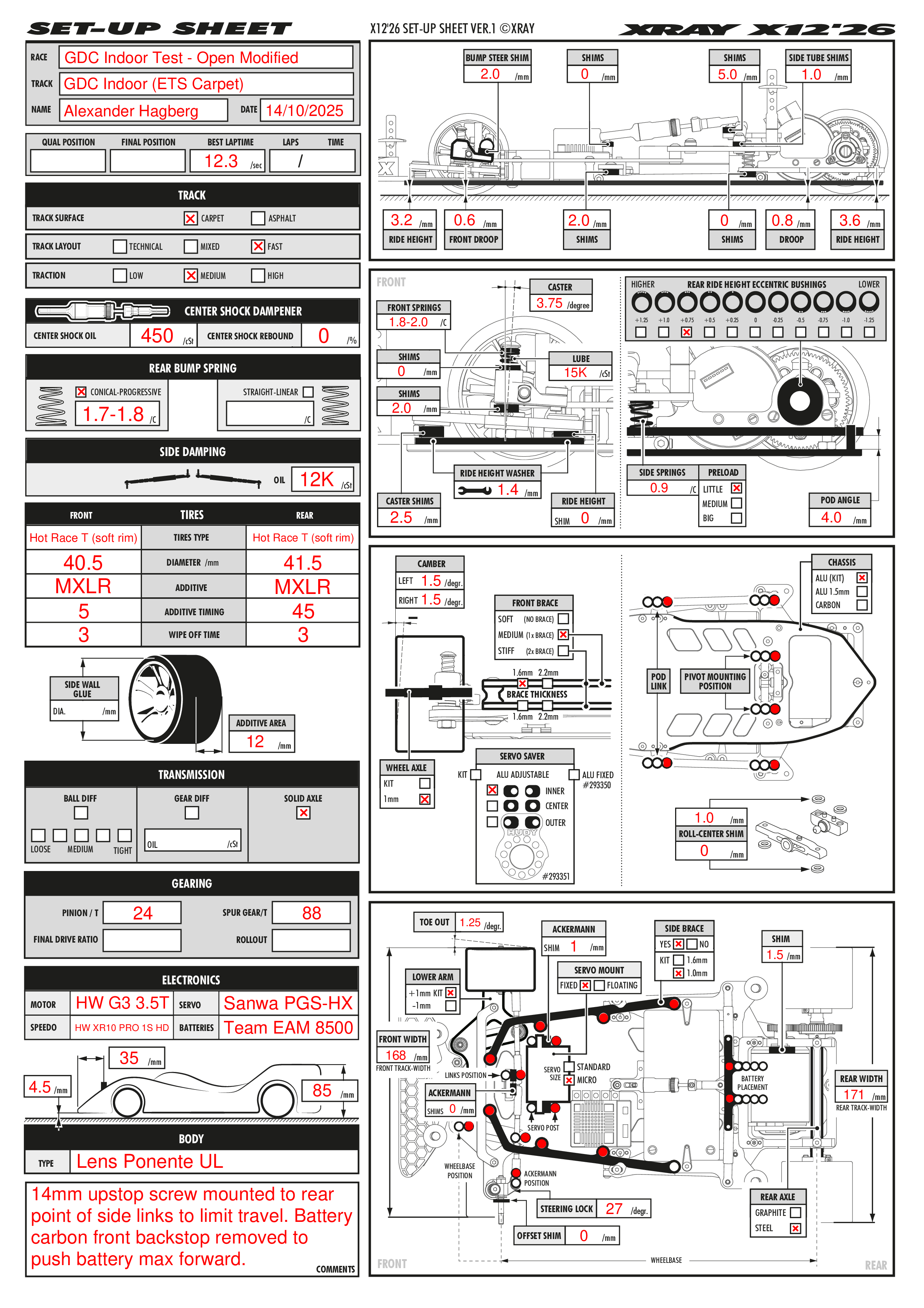 The car handled brilliantly from the first lap and was a true joy to drive! I hereby attach my set-up sheets for both car and Hobbywing Technology electronics!