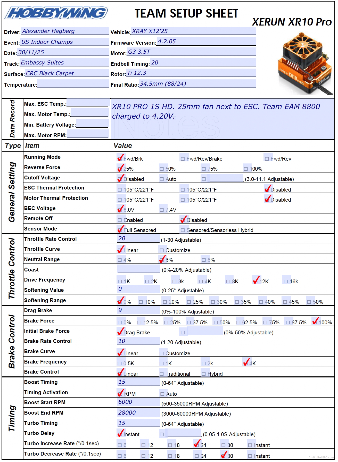 My X12'26 set-up was rather similar to my Snowbirds set-up, just with a few changes including a bit lower bump steer shim, 1.0mm side braces added, and upstop shims on the side links as per this tech tip (XRAY X12'25 tech tips, as used at the recent EFRA 1/12 European Championships).