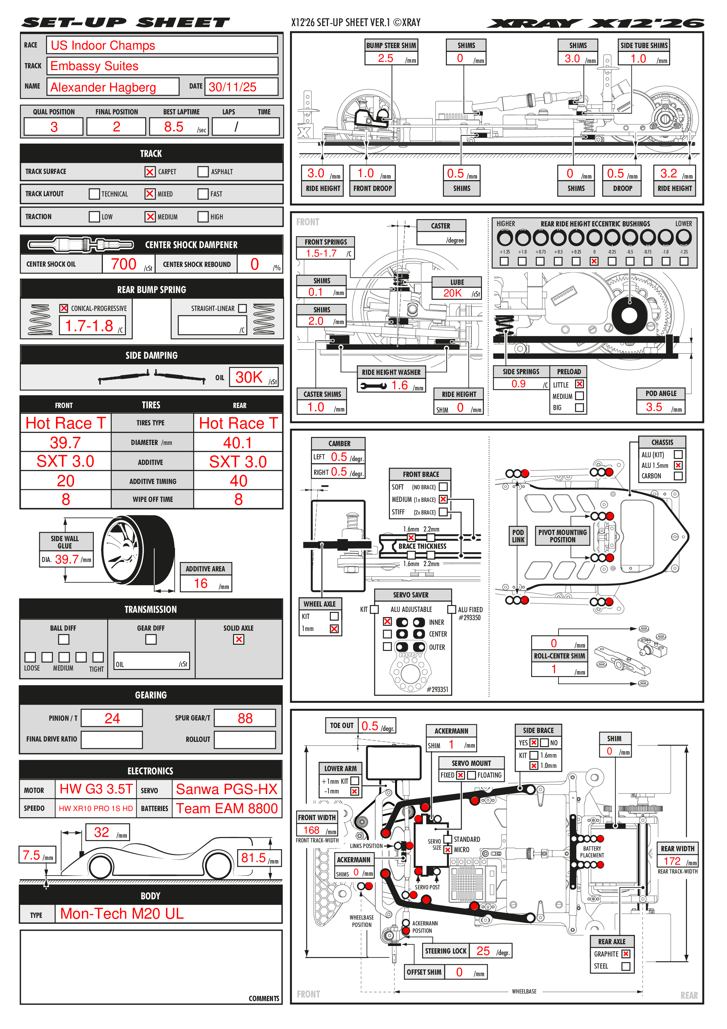 My X12'26 set-up was rather similar to my Snowbirds set-up, just with a few changes including a bit lower bump steer shim, 1.0mm side braces added, and upstop shims on the side links as per this tech tip (XRAY X12'25 tech tips, as used at the recent EFRA 1/12 European Championships).