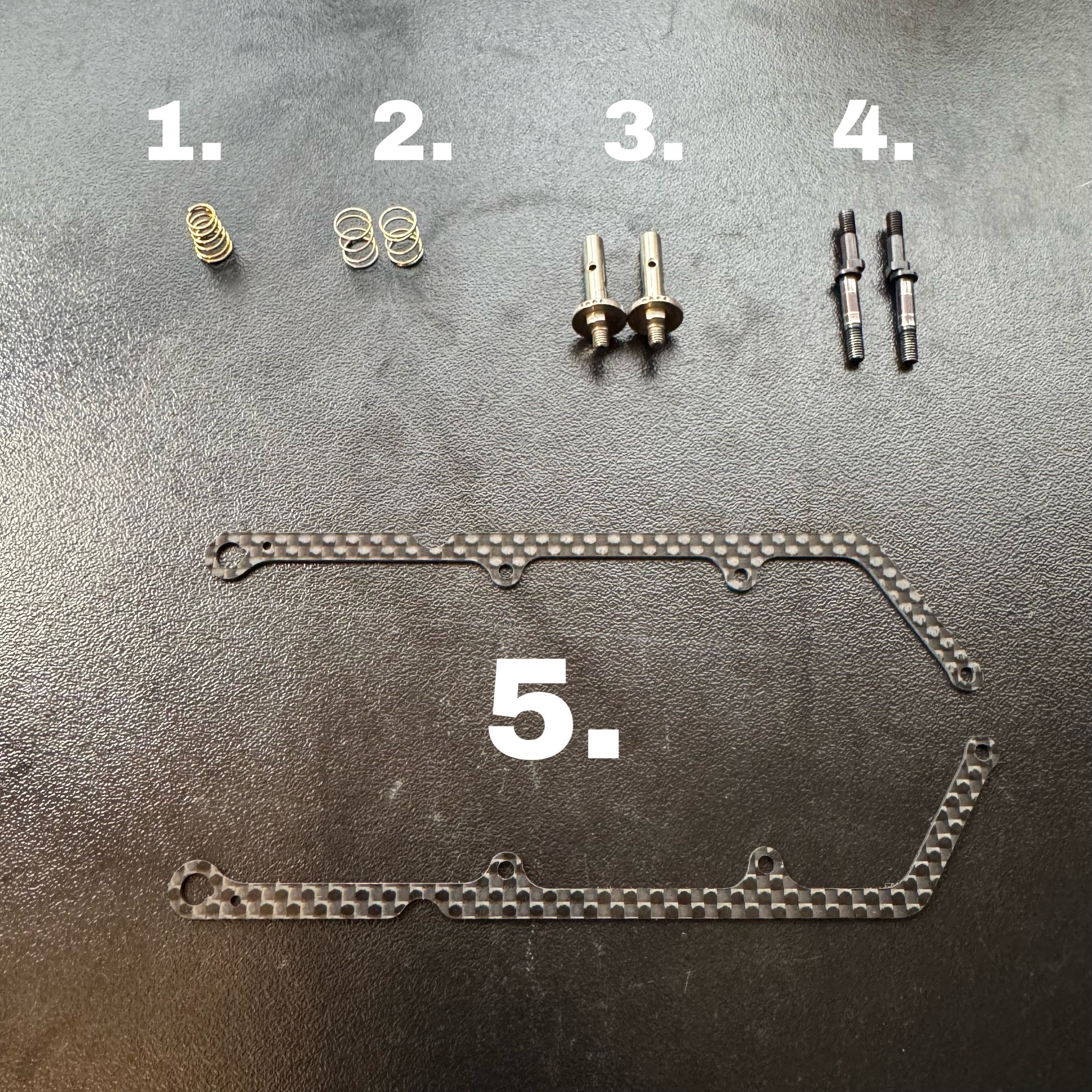 5. 376335-L - CARBON SIDE BRACE 1.0mm (2) - Improves not only overall grip, but also the drivability and feel for most conditions. Increases the chassis flex of the car, compared to with the 1.6mm standard braces.