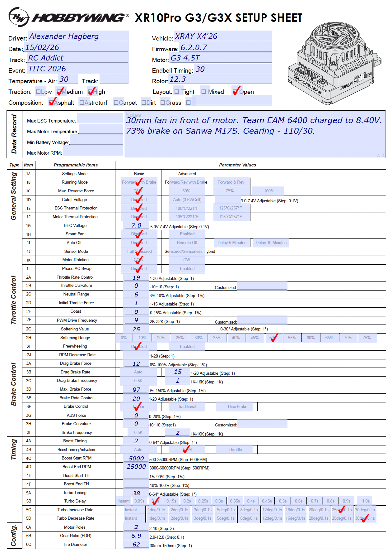 My Hobbywing Technology ESC & motor combo ran faultless as usual in the demanding conditions. I did de-tune my power as well as my drag brakes quite a bit to improve drivability on this tricky track.
