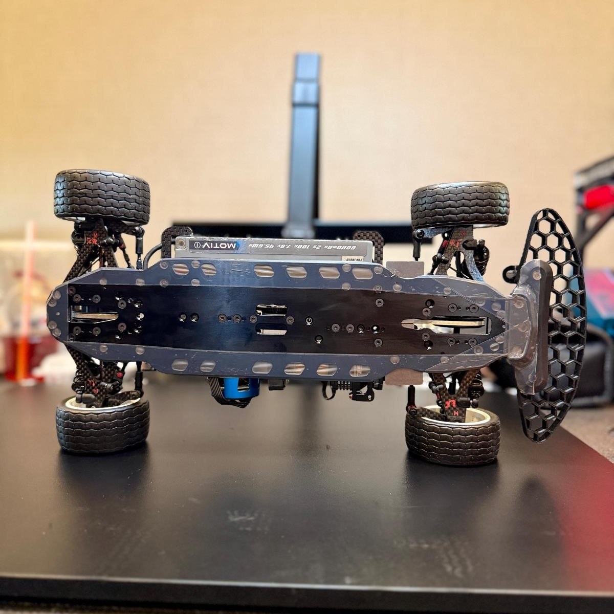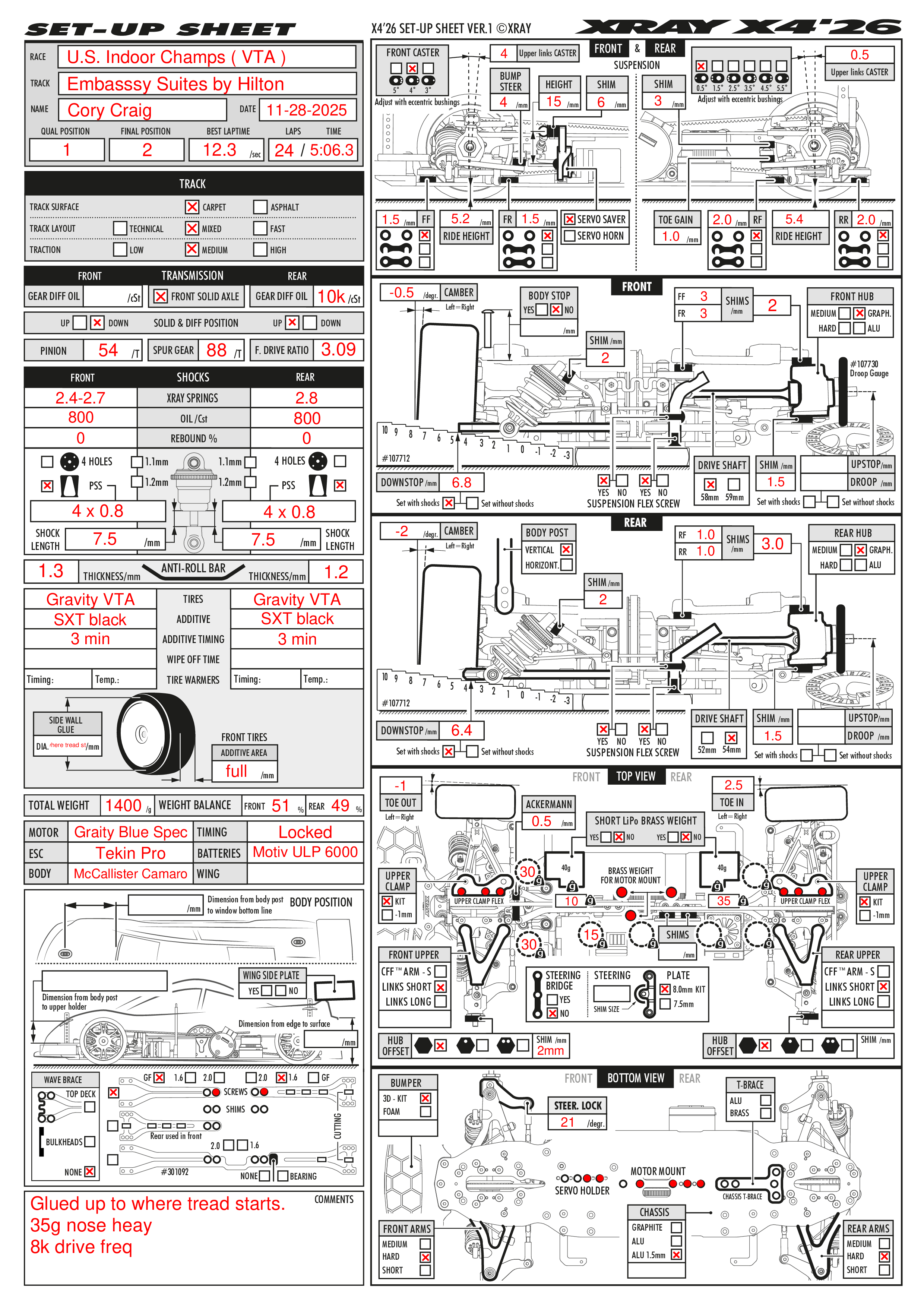 The car was not bad from the first run on the track, but a lot of the racers and the team, had issues with the cars feeling very “on the nose”. I had already started with the fiberglass top decks both front and rear initially with a 2.9 rear spring , but felt the car just had a little too much rotation and was a little numb feeling. So I replaced the rear top deck with a 1.6 graphite one and moved the grub screw back to the rear most hole to stiffen it up some more and this gave me the stability I was looking for that did not scrub the corner speed. Especially if I over drove the car.