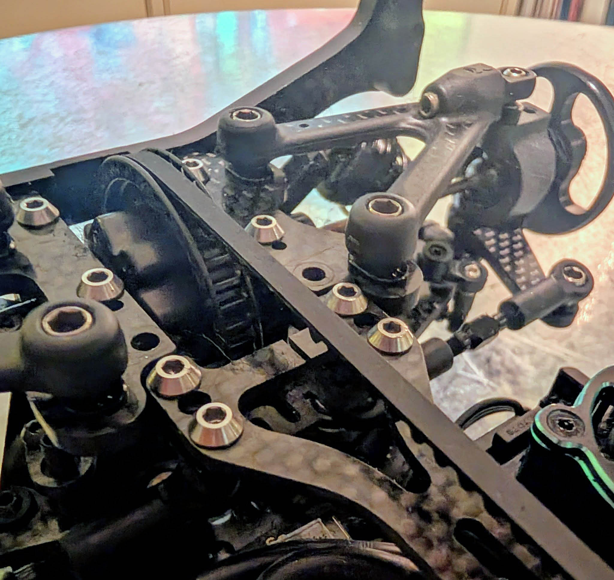 I cut the rear and third rib in the topdeck and then use the wave brace instead of the shims underneath the toe-link ballstuds. Here's why this is good: The wave brace will dissipate the load from the toe-links but also allows for relative flex of the gearbox bulkheads. By moving the waves down and as close to the ball as possible, you reduce momentum in your structure as the force lever is shortened. And that's the goal.