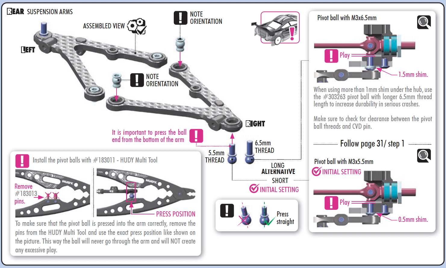 Ball studs for the hubs. Rear initial setting is 0.5mm underneath the hub. This will, in combination with the longer 6.5mm ball stud, have minimal clearance for the CVD. And thus, we recommend using 1.0mm of shim, for sufficient clearance.