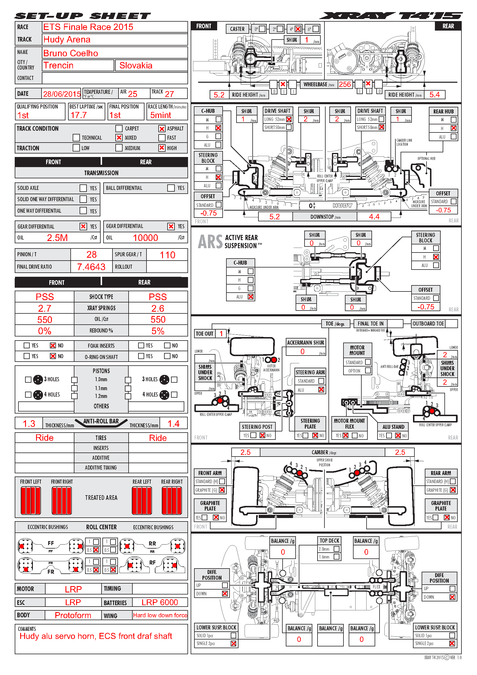 Remarks – The ETS Slovakia race winning T4 2015 of Portuguese star Bruno Coelho is running with an ARS rear end here at the Hudy Racing Arena. The car also features a titanium screw set and the new PPS shock system. His Protoform LTC-R bodyshell is fitted with lexan stiffeners for the sides and Protoform anti-tuck stiffener in the back.
