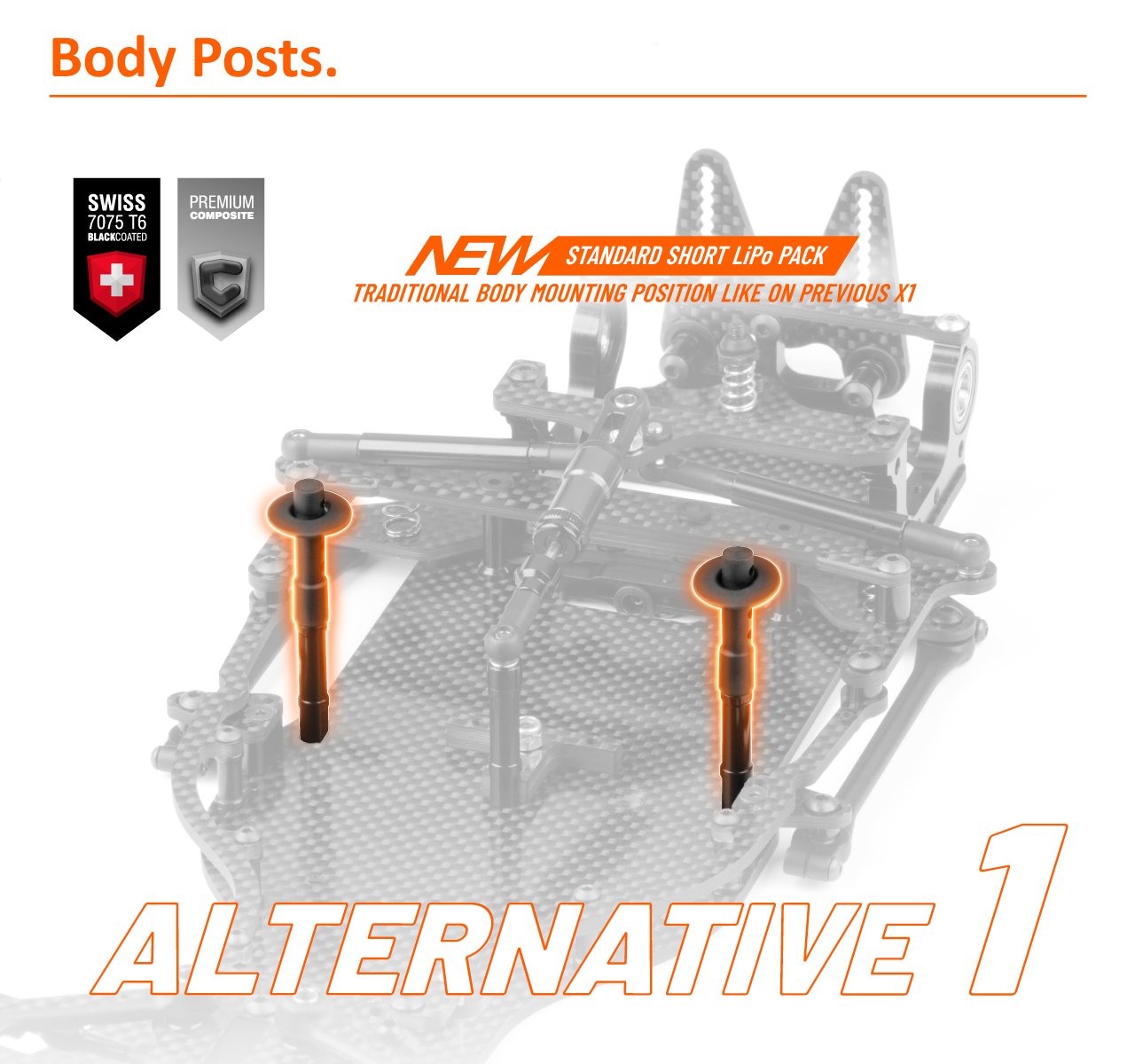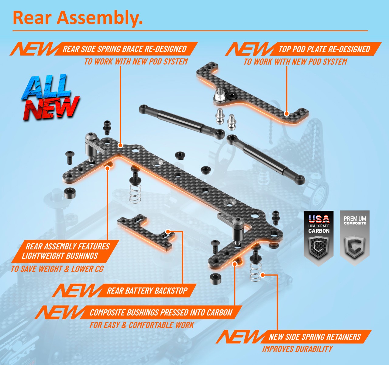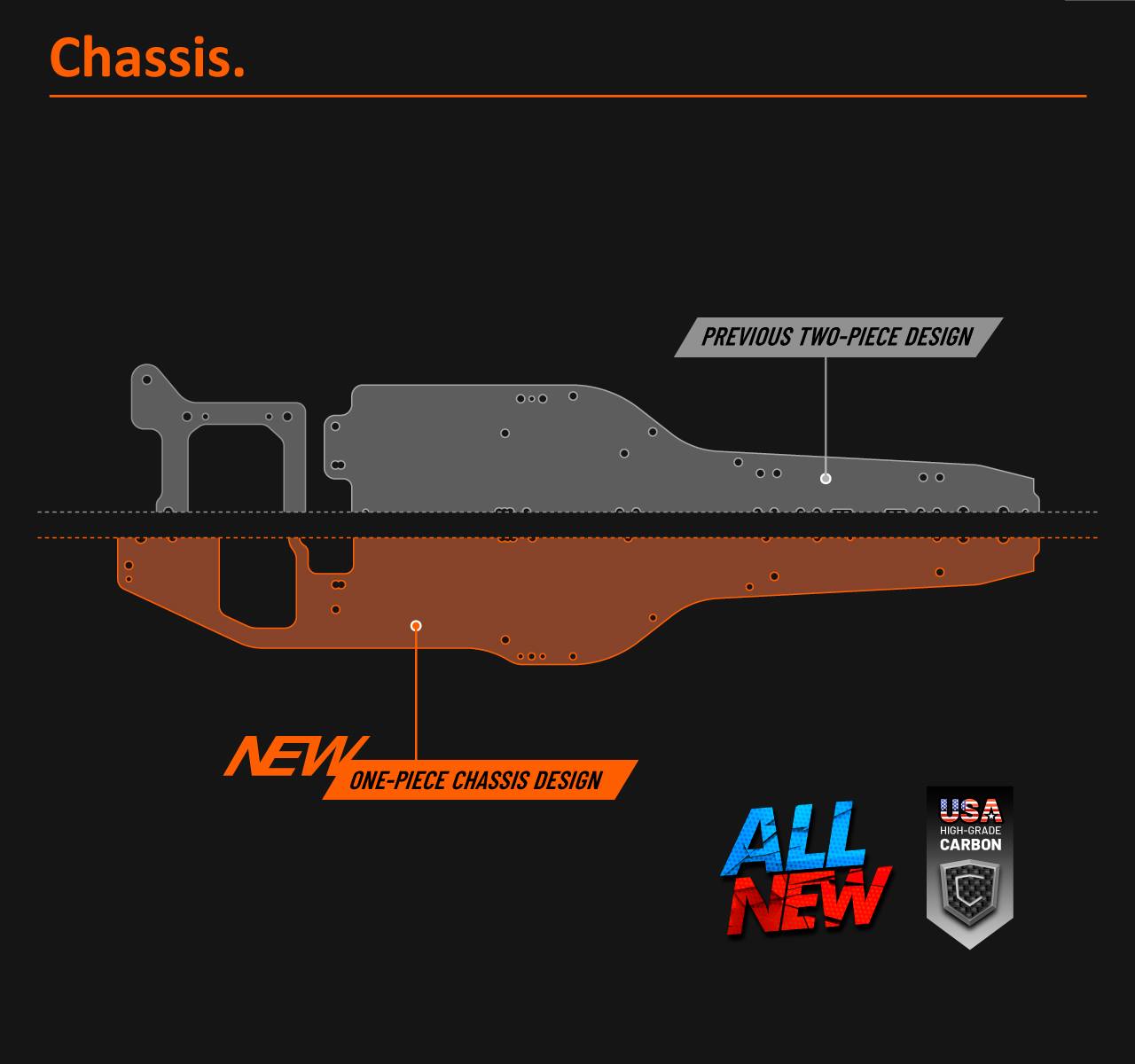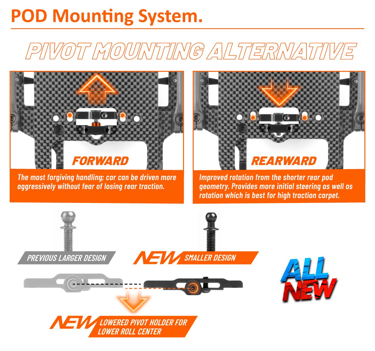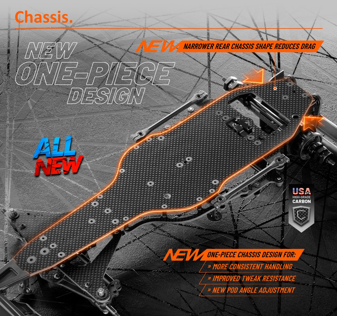 X1'25 All-new features:All-new one-piece chassis design with more consistent handling in all conditions and improved tweak resistanceNarrower chassis shape reduces chassis drag during corneringRear POD concept on top of chassis for less drag and improved tweak resistanceAdjustable POD angle controlled by set screw at the rear of chassis for fine tuningRear spring location improves forward traction with increased adjustability and lower CGRear droop adjustment through rear POD spring tension that sits in a special composite adjusterUniversal rear spring nut holder works for both conical and linear springs2-piece lower pod plate mounts to the bulkheads, offering droop and pod angle adjustments with support for the side springsUltra-light, lower CG bulkheads are foundation of new POD systemLeft side bulkhead has mounting holes incorporated to mount optional motor cooling fanLowered pivot holder and small diameter pivot ball offer lower roll center positions and greater adjustment rangeCarbon Fiber top plate for center shock and side damper mountingsNew rear carbon side spring brace aligns with new POD geometryComposite Snap Lock⢠bushings press into carbon fiber parts for secure and reliable hardware installationAll-new spring-free center shock absorber with 1-hole piston provides exceptional bump handling, low maintenance, and helps lower CG.Side braces with a narrower design save weight and leave more space for electronics and also allows better body fitmentNarrower side brace mounting holders use M2.5 screws for weight savingsAluminum side link holders with 2-pin design for more rigidity and improved tweak resistance2-pin carbon fiber side link plates integrate with aluminum holders for reliable alignment and offer 3 side link front pivot mounting positions for maximum adjustabilityNew wing mounting system which saves weight and provides cleaner design and improves the durability and track width adjustment possibilitiesNew adjustable wing angle for greater adjustment possibilitiesNew redesigned lower arms with more material around the holes for improved durability in serious crashesNew battery mounting system works with rear brace and front backstop for convenient installationTwo body post mounting position options for different battery packs allows for different configurationsAluminum side spring retainers for more precise and consistent side spring mountingMost commonly used soft front springs included in kit for best all-around starting set-up
