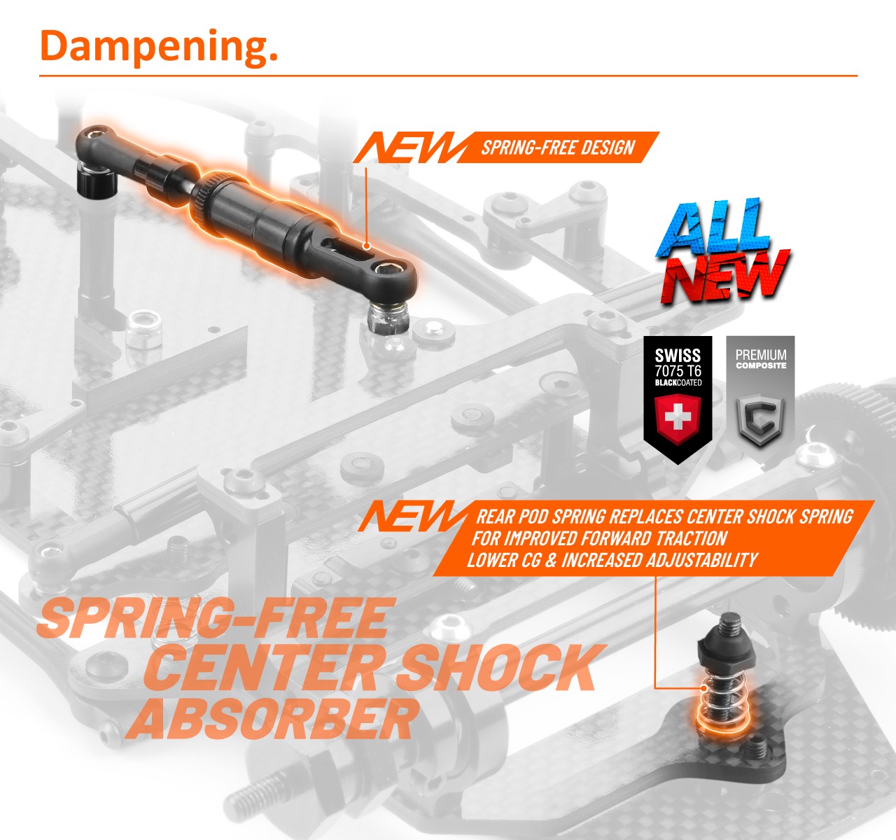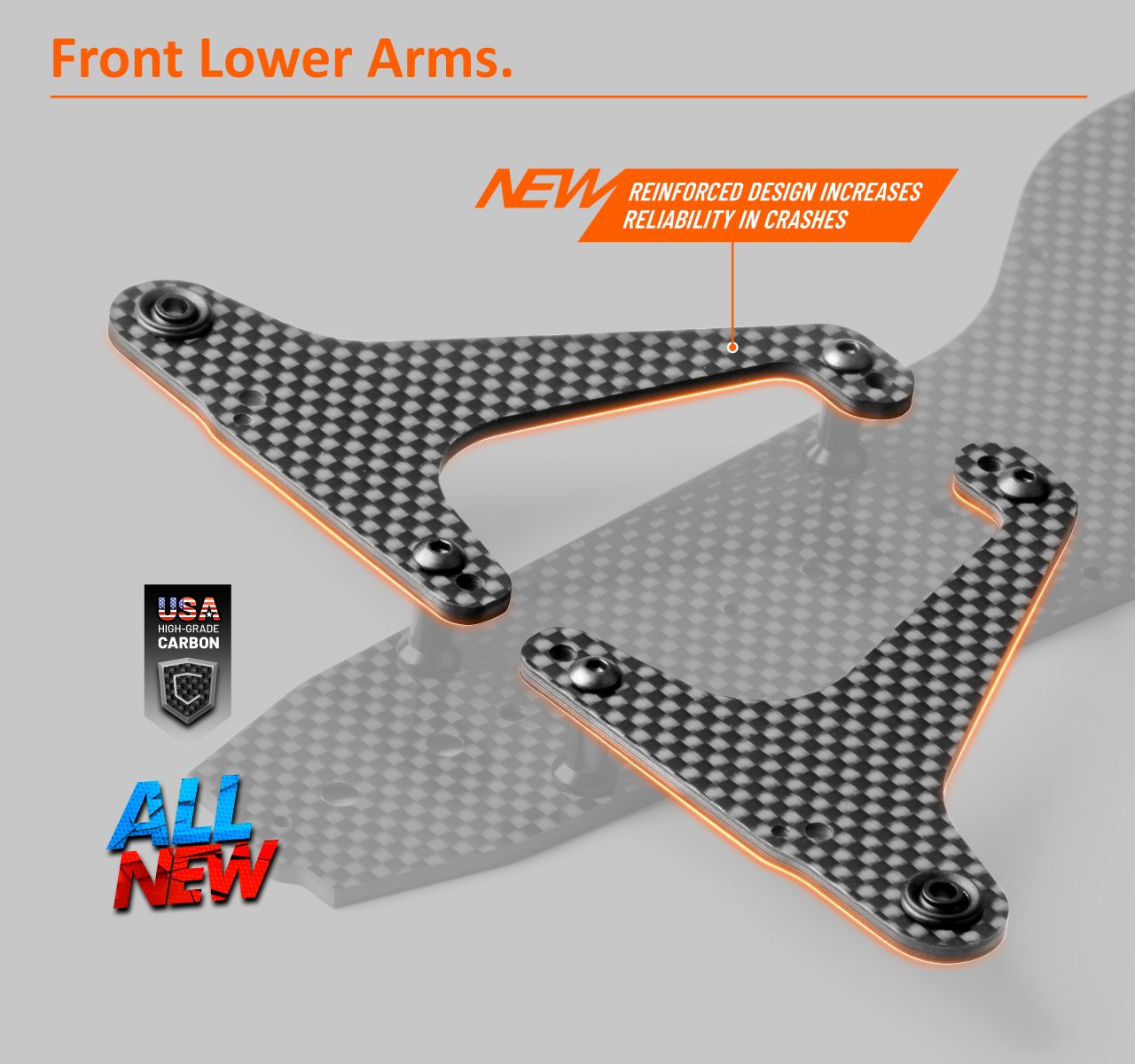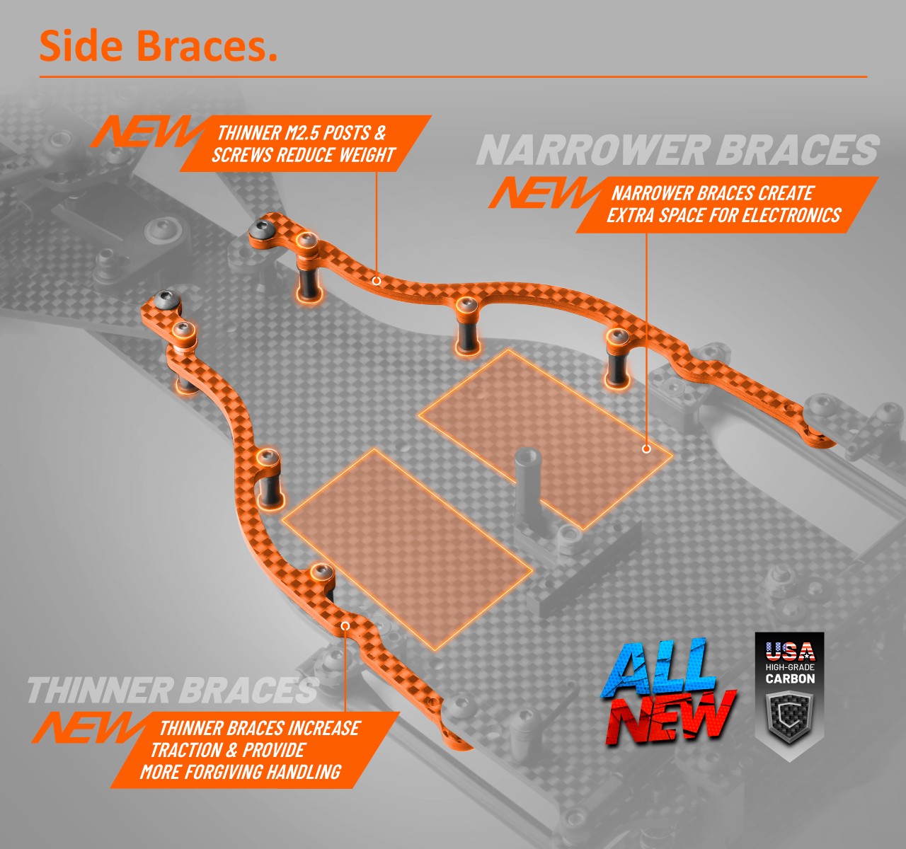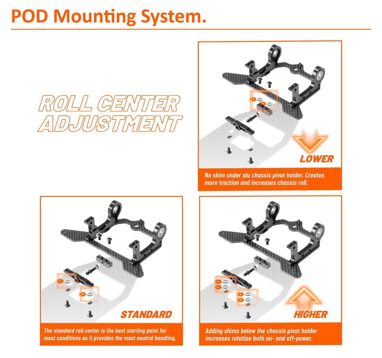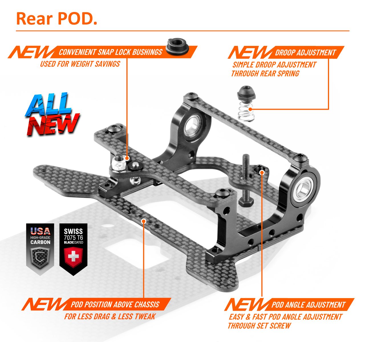 X1'25 All-new features:All-new one-piece chassis design with more consistent handling in all conditions and improved tweak resistanceNarrower chassis shape reduces chassis drag during corneringRear POD concept on top of chassis for less drag and improved tweak resistanceAdjustable POD angle controlled by set screw at the rear of chassis for fine tuningRear spring location improves forward traction with increased adjustability and lower CGRear droop adjustment through rear POD spring tension that sits in a special composite adjusterUniversal rear spring nut holder works for both conical and linear springs2-piece lower pod plate mounts to the bulkheads, offering droop and pod angle adjustments with support for the side springsUltra-light, lower CG bulkheads are foundation of new POD systemLeft side bulkhead has mounting holes incorporated to mount optional motor cooling fanLowered pivot holder and small diameter pivot ball offer lower roll center positions and greater adjustment rangeCarbon Fiber top plate for center shock and side damper mountingsNew rear carbon side spring brace aligns with new POD geometryComposite Snap Lock⢠bushings press into carbon fiber parts for secure and reliable hardware installationAll-new spring-free center shock absorber with 1-hole piston provides exceptional bump handling, low maintenance, and helps lower CG.Side braces with a narrower design save weight and leave more space for electronics and also allows better body fitmentNarrower side brace mounting holders use M2.5 screws for weight savingsAluminum side link holders with 2-pin design for more rigidity and improved tweak resistance2-pin carbon fiber side link plates integrate with aluminum holders for reliable alignment and offer 3 side link front pivot mounting positions for maximum adjustabilityNew wing mounting system which saves weight and provides cleaner design and improves the durability and track width adjustment possibilitiesNew adjustable wing angle for greater adjustment possibilitiesNew redesigned lower arms with more material around the holes for improved durability in serious crashesNew battery mounting system works with rear brace and front backstop for convenient installationTwo body post mounting position options for different battery packs allows for different configurationsAluminum side spring retainers for more precise and consistent side spring mountingMost commonly used soft front springs included in kit for best all-around starting set-up