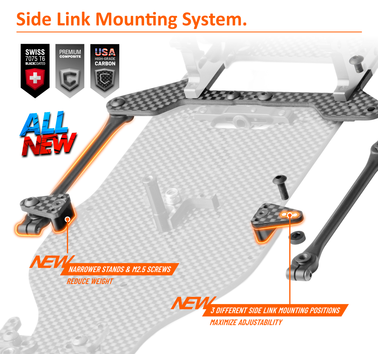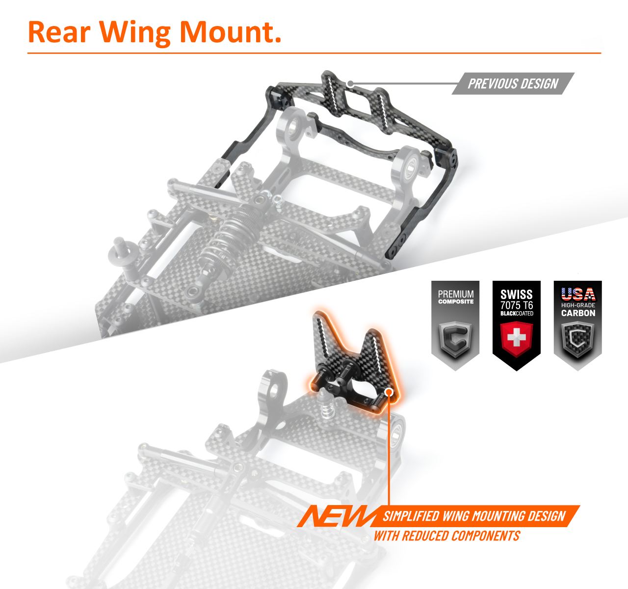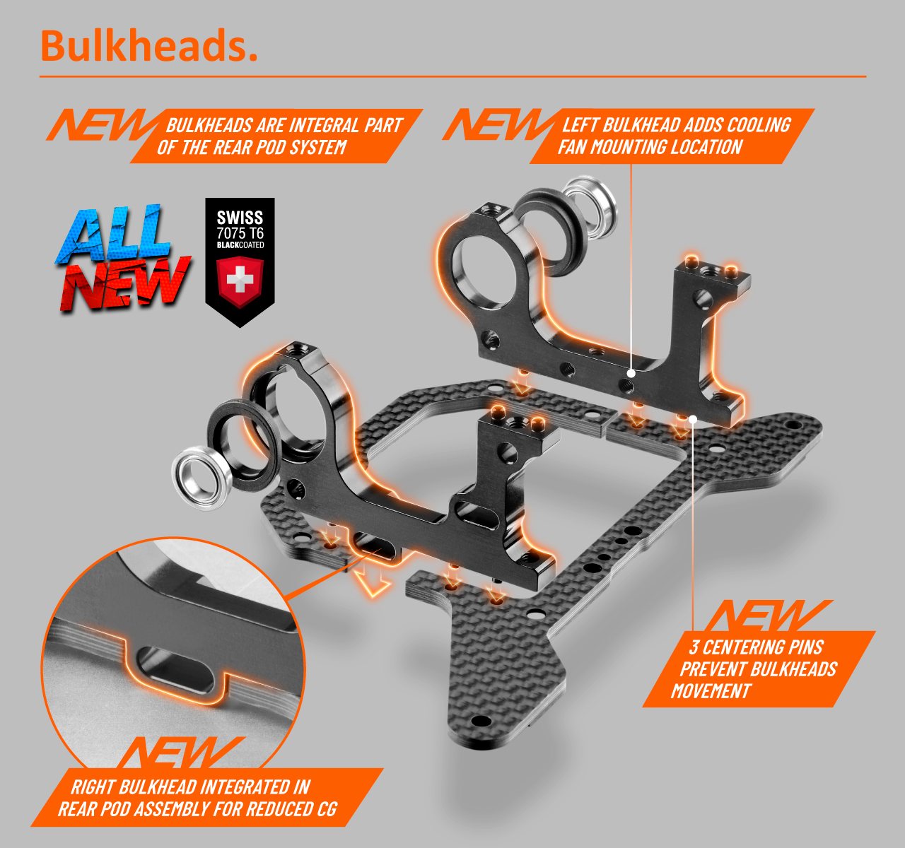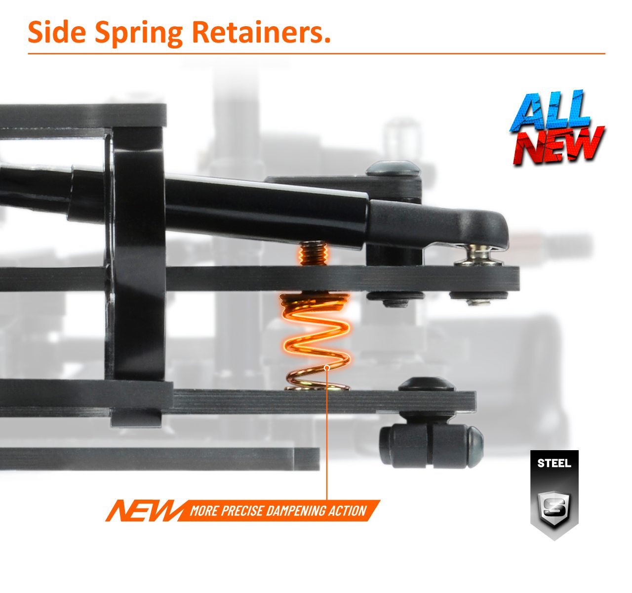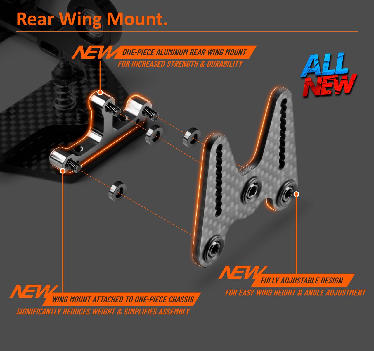 X1'25 All-new features:All-new one-piece chassis design with more consistent handling in all conditions and improved tweak resistanceNarrower chassis shape reduces chassis drag during corneringRear POD concept on top of chassis for less drag and improved tweak resistanceAdjustable POD angle controlled by set screw at the rear of chassis for fine tuningRear spring location improves forward traction with increased adjustability and lower CGRear droop adjustment through rear POD spring tension that sits in a special composite adjusterUniversal rear spring nut holder works for both conical and linear springs2-piece lower pod plate mounts to the bulkheads, offering droop and pod angle adjustments with support for the side springsUltra-light, lower CG bulkheads are foundation of new POD systemLeft side bulkhead has mounting holes incorporated to mount optional motor cooling fanLowered pivot holder and small diameter pivot ball offer lower roll center positions and greater adjustment rangeCarbon Fiber top plate for center shock and side damper mountingsNew rear carbon side spring brace aligns with new POD geometryComposite Snap Lock⢠bushings press into carbon fiber parts for secure and reliable hardware installationAll-new spring-free center shock absorber with 1-hole piston provides exceptional bump handling, low maintenance, and helps lower CG.Side braces with a narrower design save weight and leave more space for electronics and also allows better body fitmentNarrower side brace mounting holders use M2.5 screws for weight savingsAluminum side link holders with 2-pin design for more rigidity and improved tweak resistance2-pin carbon fiber side link plates integrate with aluminum holders for reliable alignment and offer 3 side link front pivot mounting positions for maximum adjustabilityNew wing mounting system which saves weight and provides cleaner design and improves the durability and track width adjustment possibilitiesNew adjustable wing angle for greater adjustment possibilitiesNew redesigned lower arms with more material around the holes for improved durability in serious crashesNew battery mounting system works with rear brace and front backstop for convenient installationTwo body post mounting position options for different battery packs allows for different configurationsAluminum side spring retainers for more precise and consistent side spring mountingMost commonly used soft front springs included in kit for best all-around starting set-up