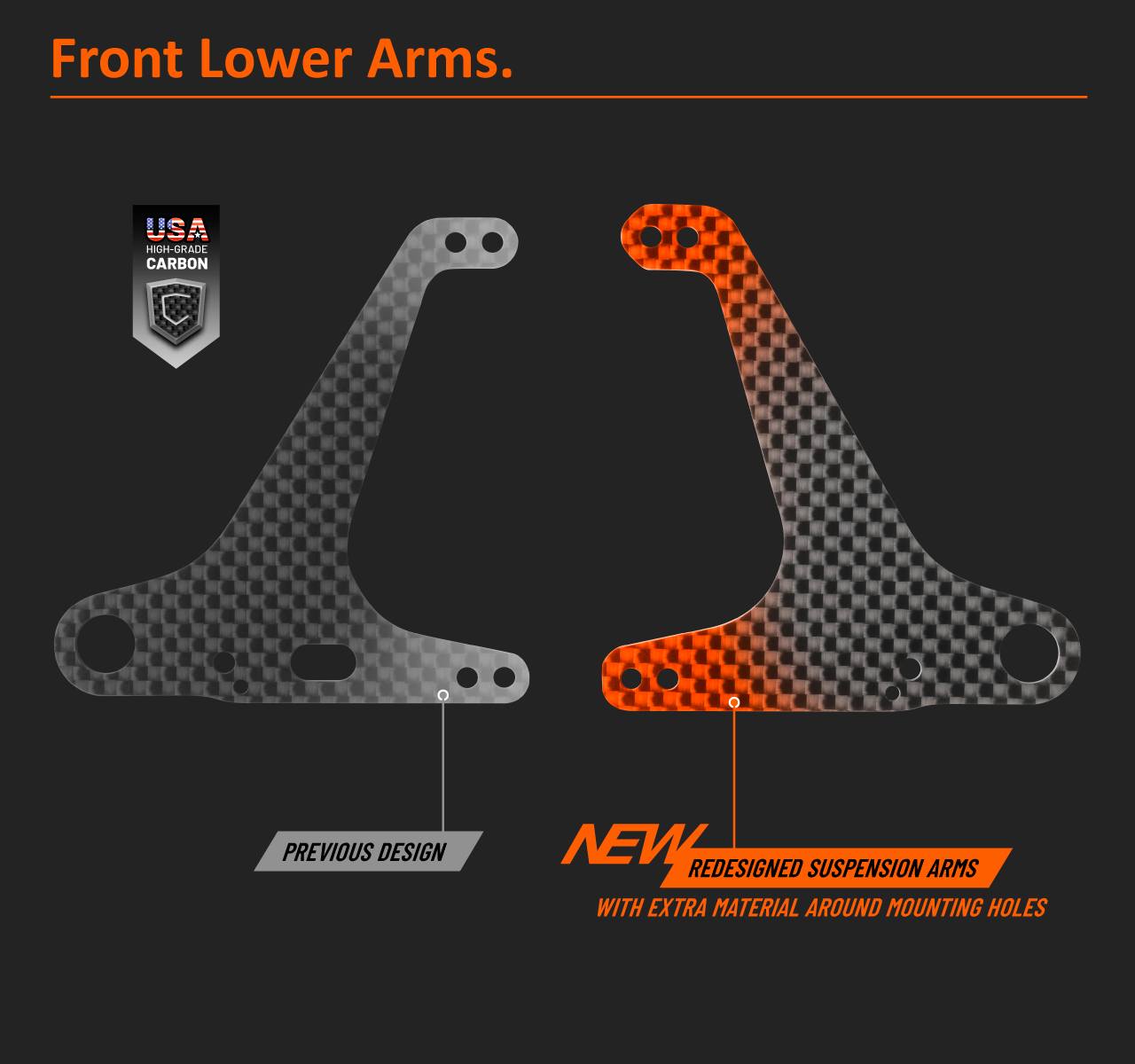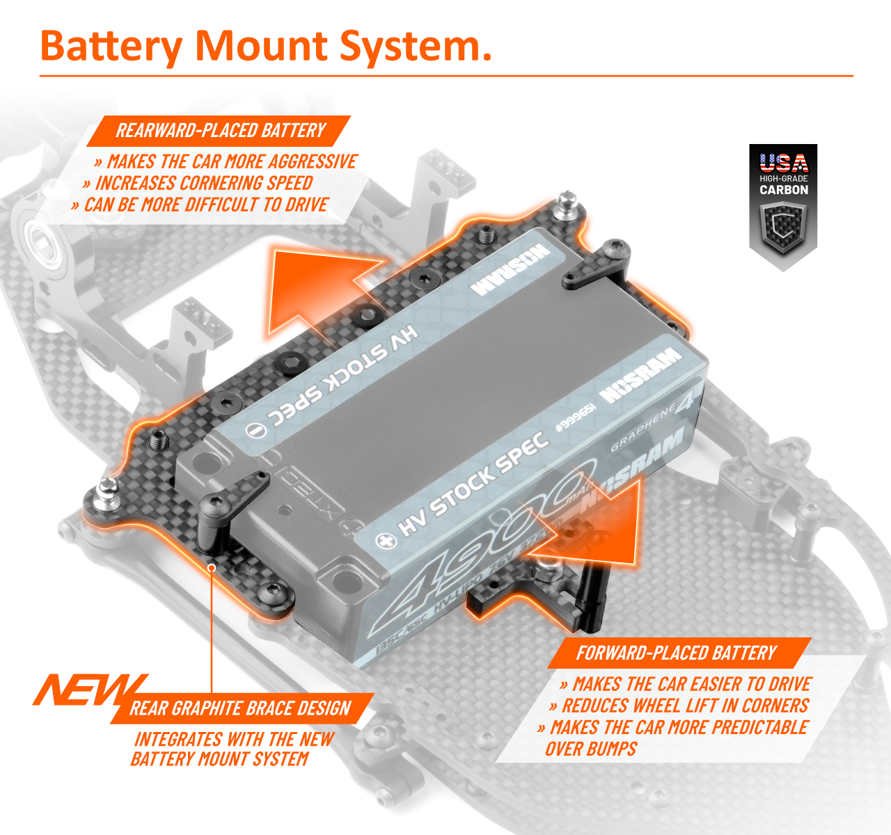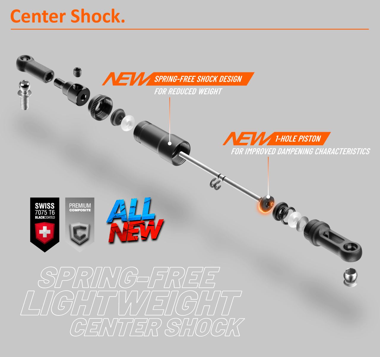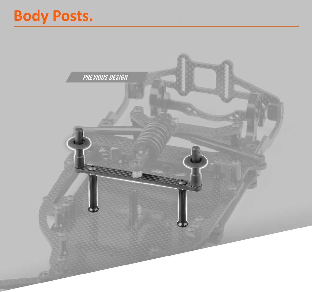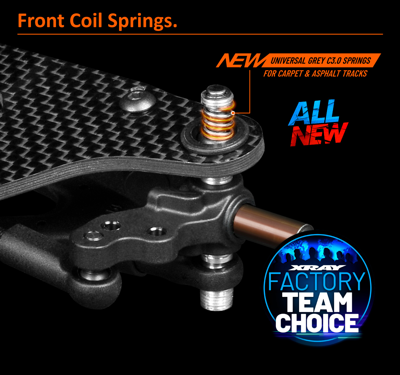 X1'25 All-new features:All-new one-piece chassis design with more consistent handling in all conditions and improved tweak resistanceNarrower chassis shape reduces chassis drag during corneringRear POD concept on top of chassis for less drag and improved tweak resistanceAdjustable POD angle controlled by set screw at the rear of chassis for fine tuningRear spring location improves forward traction with increased adjustability and lower CGRear droop adjustment through rear POD spring tension that sits in a special composite adjusterUniversal rear spring nut holder works for both conical and linear springs2-piece lower pod plate mounts to the bulkheads, offering droop and pod angle adjustments with support for the side springsUltra-light, lower CG bulkheads are foundation of new POD systemLeft side bulkhead has mounting holes incorporated to mount optional motor cooling fanLowered pivot holder and small diameter pivot ball offer lower roll center positions and greater adjustment rangeCarbon Fiber top plate for center shock and side damper mountingsNew rear carbon side spring brace aligns with new POD geometryComposite Snap Lock⢠bushings press into carbon fiber parts for secure and reliable hardware installationAll-new spring-free center shock absorber with 1-hole piston provides exceptional bump handling, low maintenance, and helps lower CG.Side braces with a narrower design save weight and leave more space for electronics and also allows better body fitmentNarrower side brace mounting holders use M2.5 screws for weight savingsAluminum side link holders with 2-pin design for more rigidity and improved tweak resistance2-pin carbon fiber side link plates integrate with aluminum holders for reliable alignment and offer 3 side link front pivot mounting positions for maximum adjustabilityNew wing mounting system which saves weight and provides cleaner design and improves the durability and track width adjustment possibilitiesNew adjustable wing angle for greater adjustment possibilitiesNew redesigned lower arms with more material around the holes for improved durability in serious crashesNew battery mounting system works with rear brace and front backstop for convenient installationTwo body post mounting position options for different battery packs allows for different configurationsAluminum side spring retainers for more precise and consistent side spring mountingMost commonly used soft front springs included in kit for best all-around starting set-up