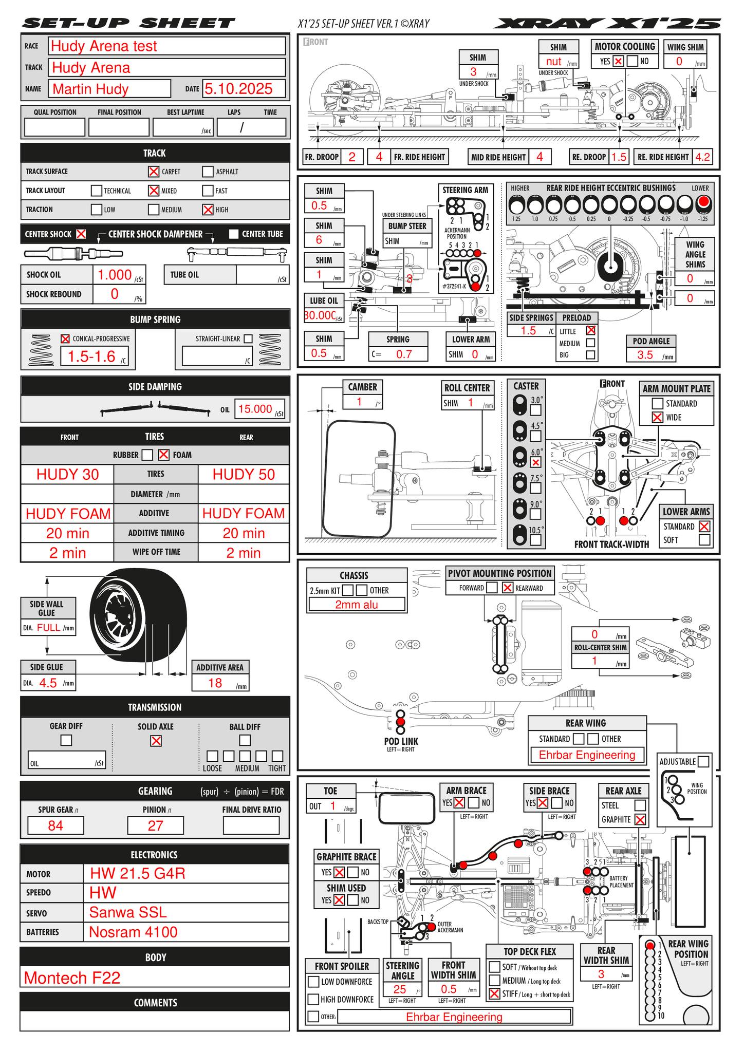 Below is the setup I recommend based on my testing. The car felt very neutral and easy to drive—well-balanced and predictable. Given the already high traction level at the Hudy Arena, I opted for a solid rear axle to maximize steering and on-power acceleration.