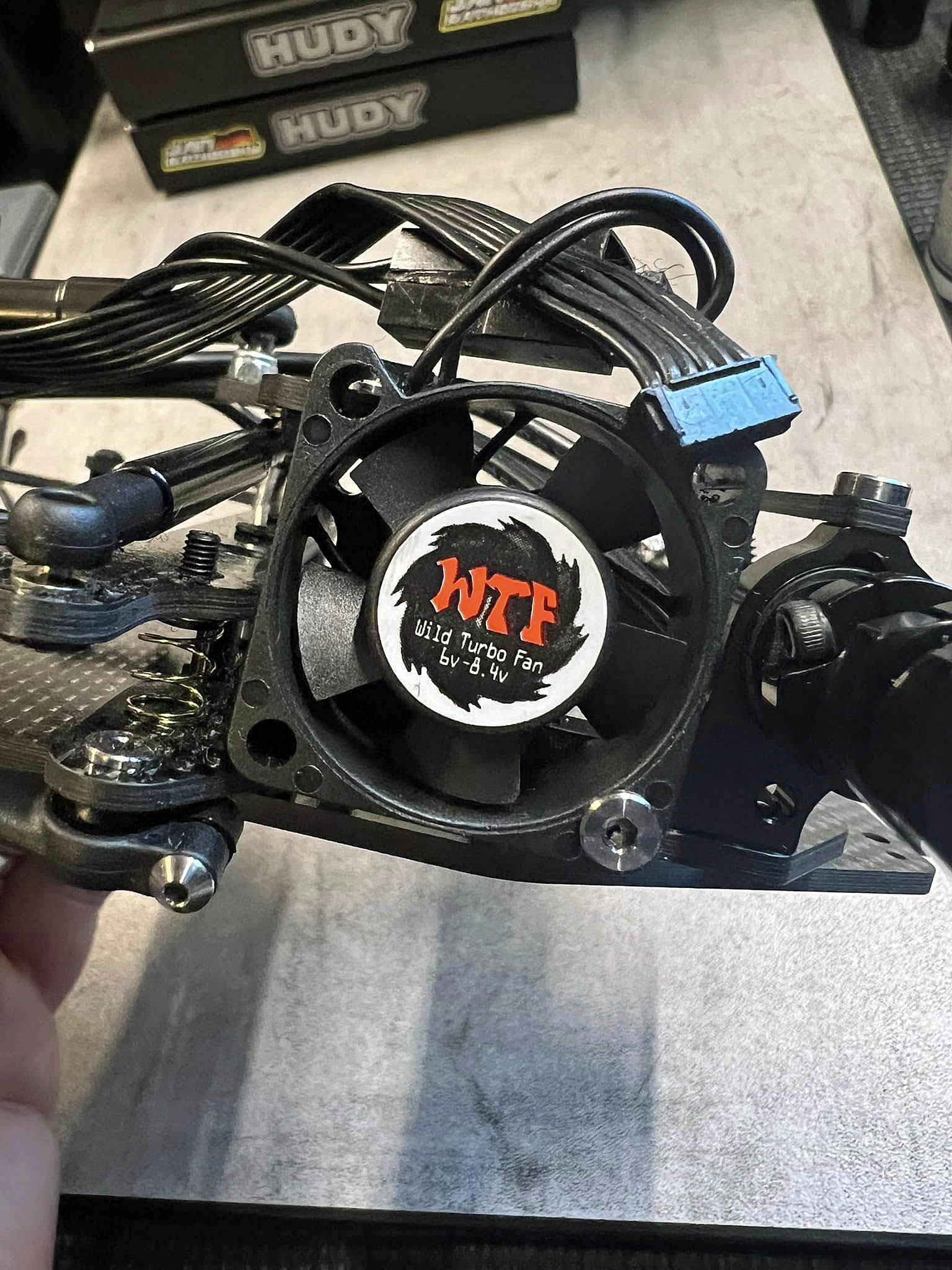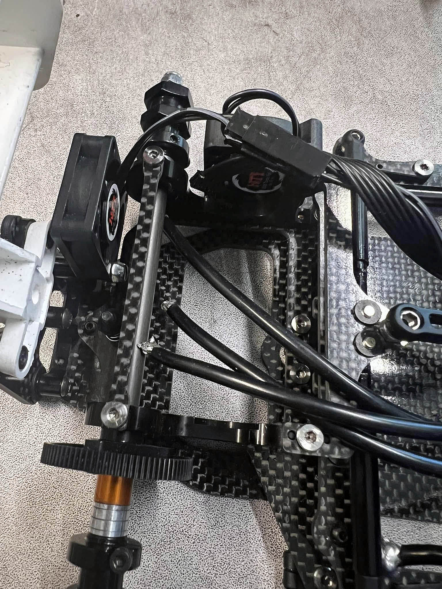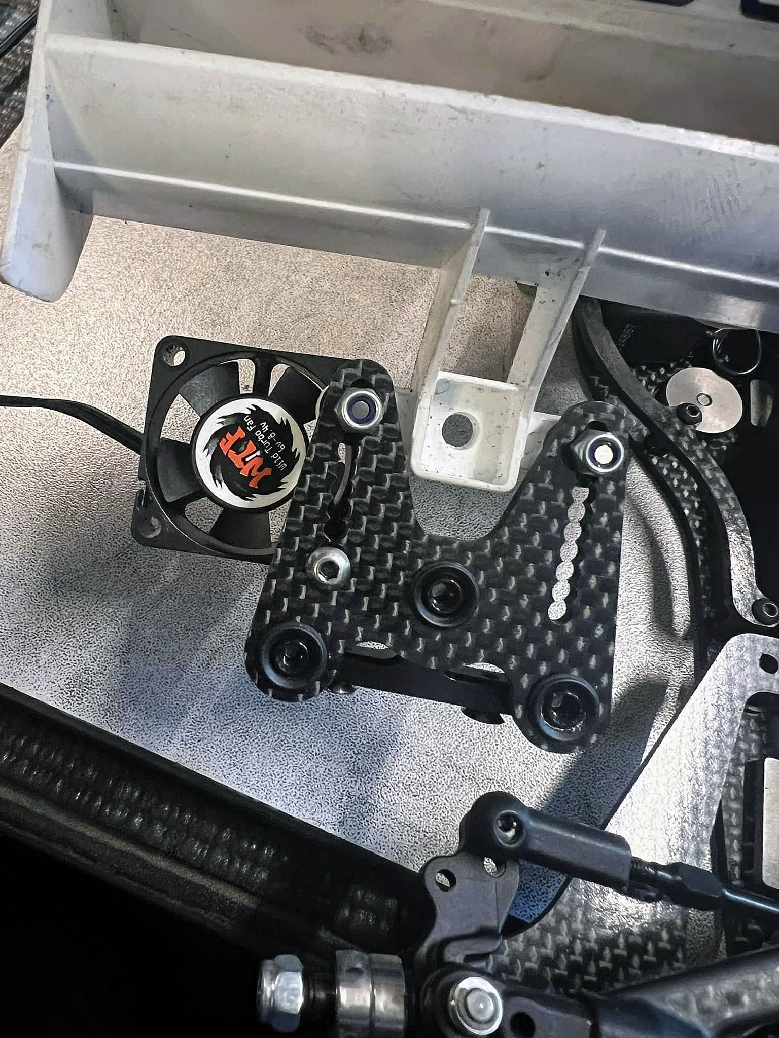 Here is a little info how I mounted 2 fans on my Xray X1. As this 25.5 motors are going very hot. With EU 21.5 motors I guess 1 is enough to safe weight.