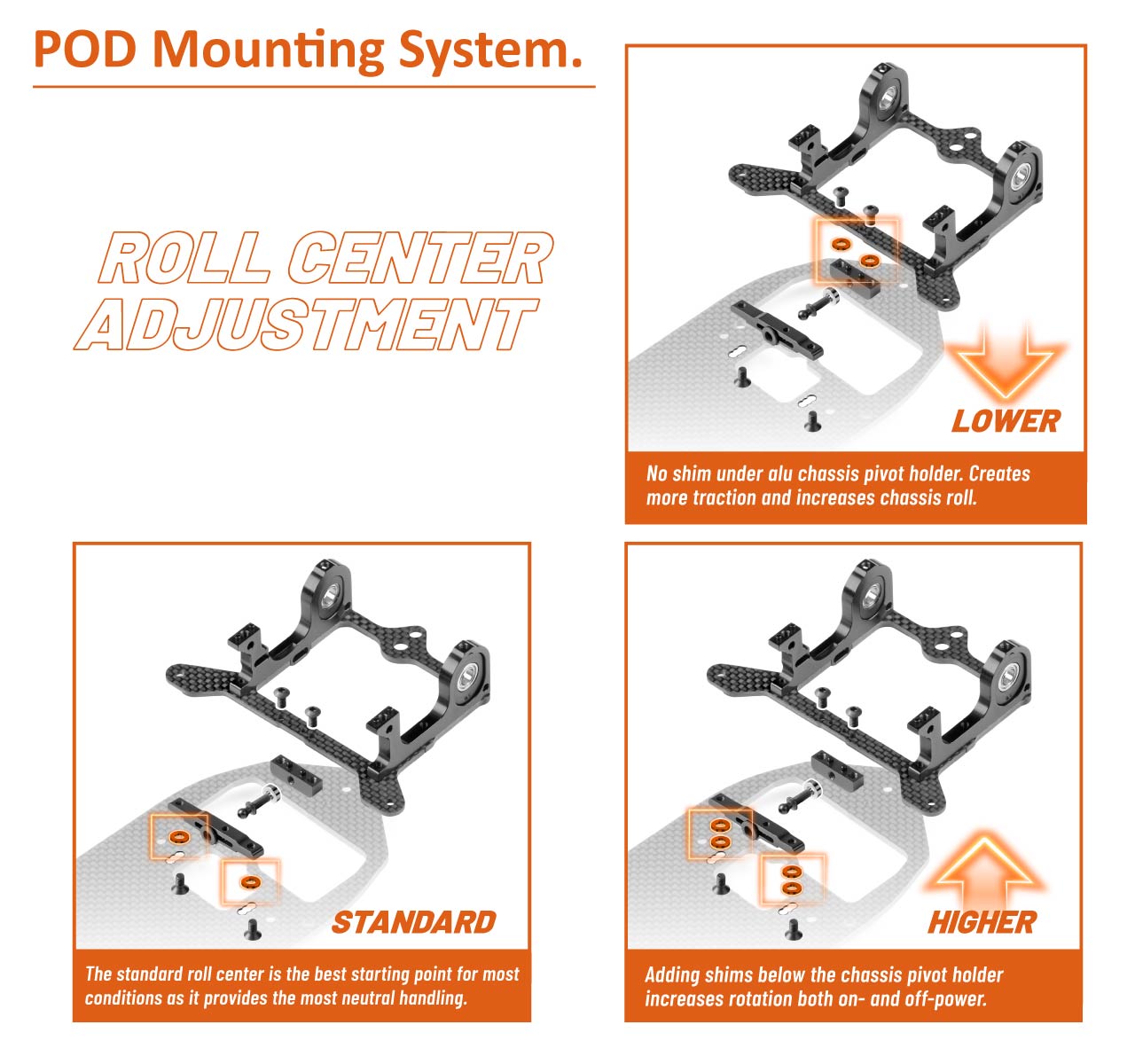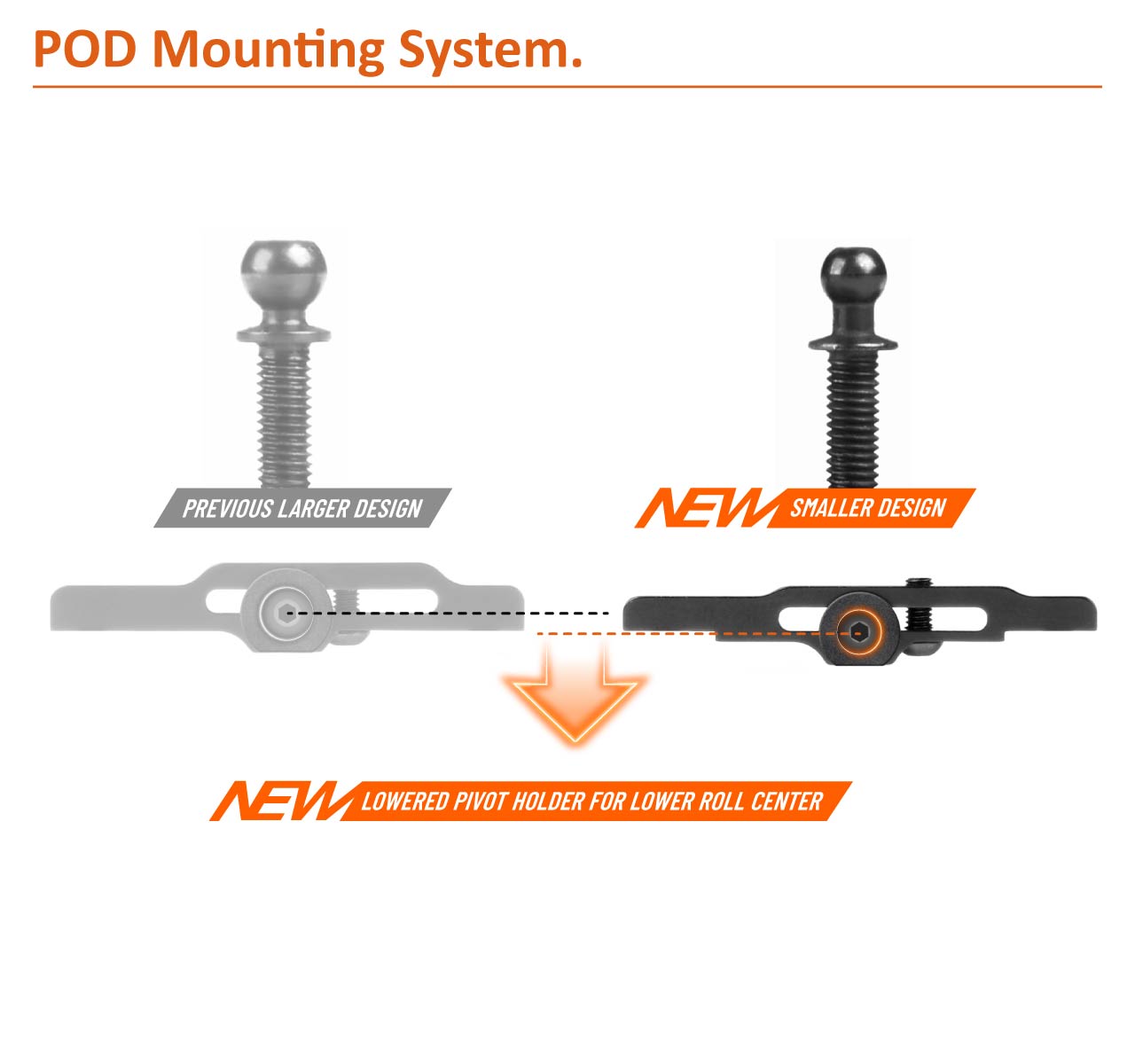 Low center pivot holder controls pod movement and roll center adjustment. A small diameter pivot ball allows for the lower roll center options, and the forward center pivot position gives maximum adjustability.
